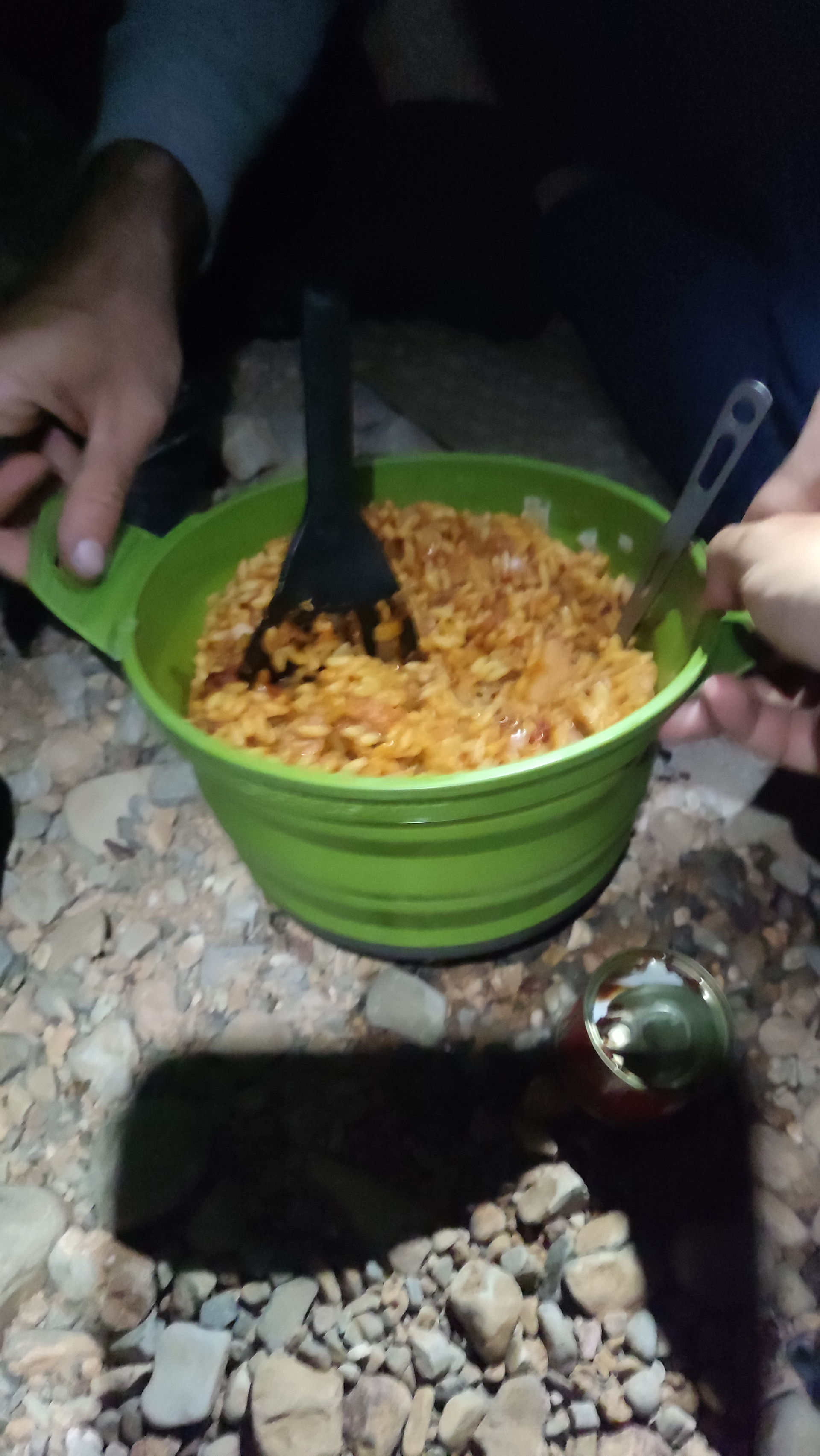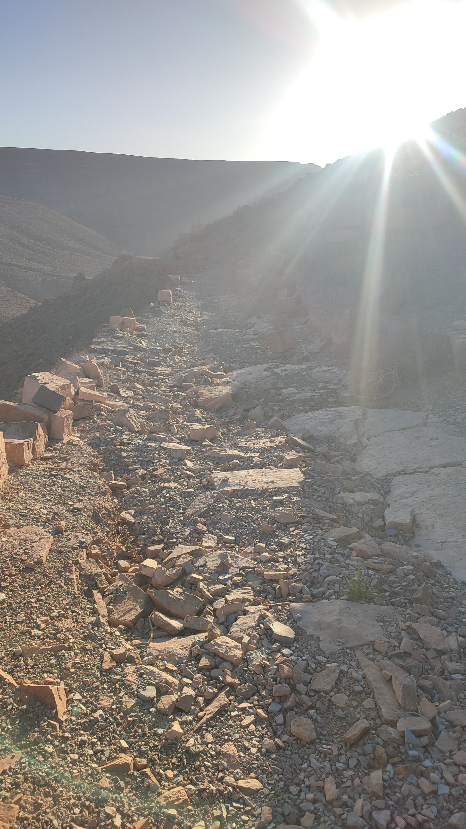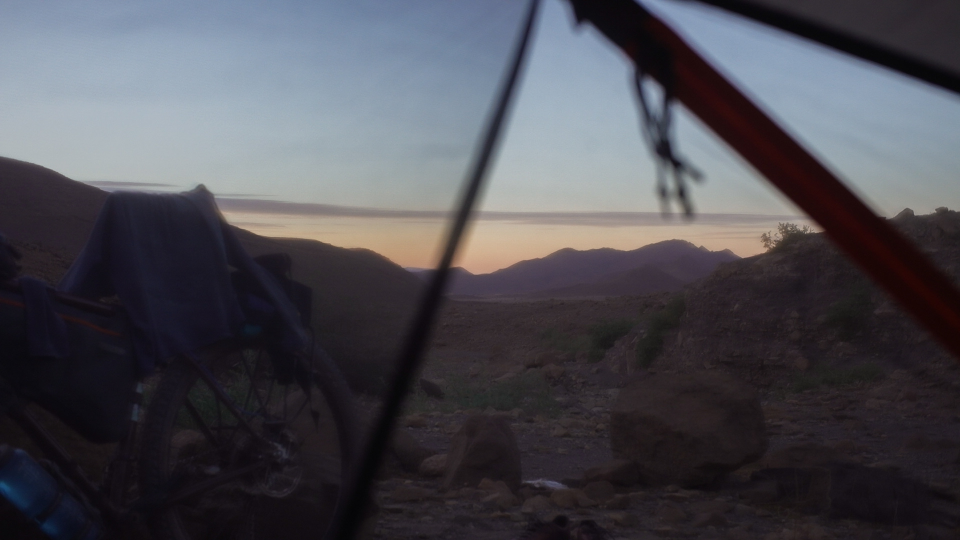 Langsam wird es Zeit für einen Platz für die Zelte, leider ist der Wind ziemlich stark, und mein alter Bekannter, das Flussbett, ist wieder da. Schnell würden wir nicht voran kommen, und nirgendwo ist eine Ruine für Windschutz zu sehen. Immerhin werden wir in einem Nebenarm des Flussbetts fündig, der Boden ist komplett voll mit Steinen, aber immerhin ist der Wind nicht so stark. Wir bauen die Zelte auf, und im letzten Licht gibt es die übliche Flaschendusche. Danach wird gekocht, Basil und ich machen gemeinsam einen riesen Topf Nudeln, diese sollten meinen Magen vielleicht etwas weniger belasten als nochmal Linsensuppe. Vor dem Essen war mir kalt und ich habe eine Jacke angezogen, dem Rest war aber eher warm. Mit vollem Magen kommt aber auch bei mir die Energie zurück. Kurz vorm Ins-Zelt-Steigen bekomme ich Besuch von einer Libelle im Zelt. Basil erzählt, dass er gestern auch ein Libellenpaar in seinem Zelt hatte, die er aber töten musste. Jack bezeichnet das Drama als marokkanisches Romeo und Julia. Unter dem wie immer beeindruckenden Sternenhimmel werden Vor- und Nachteile von Schlafsocken diskutiert. Ich bin besonders froh über meine dicke Luft Isomatte, die mich den sehr steinigen Untergrund nicht spüren lässt.
