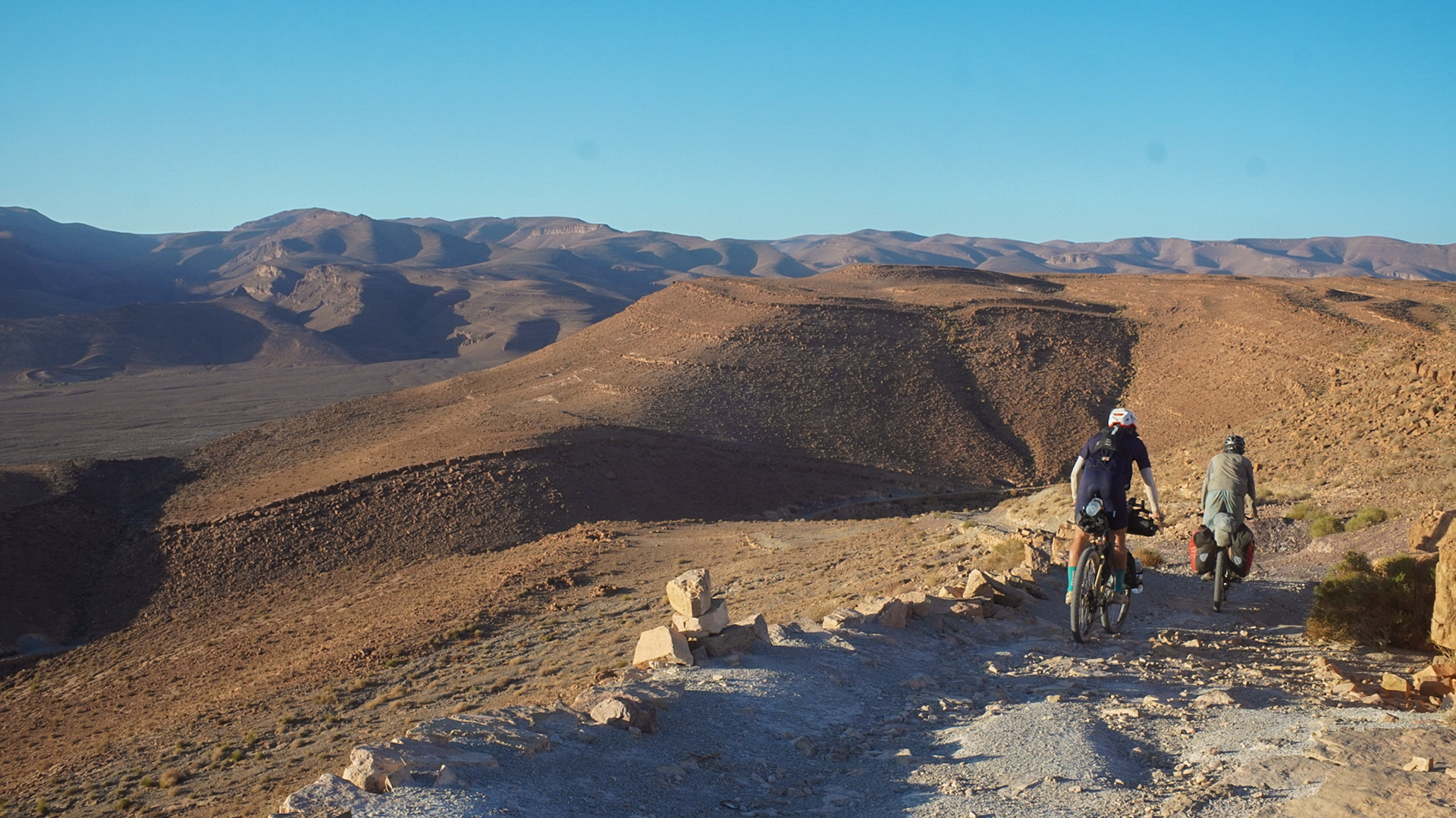 Danach geht es erstmal schön zehn Kilometer bergauf. Nach drei Kilometern hänge ich wieder zwischen den Steinen am Straßenrand. Jetzt scheint sich der Magen aber beruhigt zu haben, und ich habe nur, wie der Rest auch, Blähungen. Das bevorzuge ich, auch wenn ich dem Ganzen auf dem Rad nicht traue. Ich werfe zwei Kohletabletten ein, danach geht es weiter. Wir haben noch ein bisschen was vor uns. Wie immer geht es steil bergauf, irgendwann fühlt sich mein Hinterrad komisch an. Ich bekomme einen Platten, natürlich in dem Laufrad mit dem neuen Schlauch. Mal wieder frage ich mich, womit ich das ganze Pech auf dem Trip verdient habe. Flicken kommt aus Zeitgründen erstmal nicht in Frage, lediglich schnell aufpumpen und weiter. Gestern ist mir beim Pumpen eine Blase an der Hand aufgerissen. Ob diese vom Pumpen oder vom Lenker halten stammt, weiß ich nicht genau, sie behindert aber beides. Sein Leid klagen, bringt nichts, dafür werde ich mit einer großartigen Abfahrt belohnt. Sie stellt alles Bisherige in den Schatten, steinig, steil, technisch anspruchsvoll. Alle Probleme sind kurz vergessen.