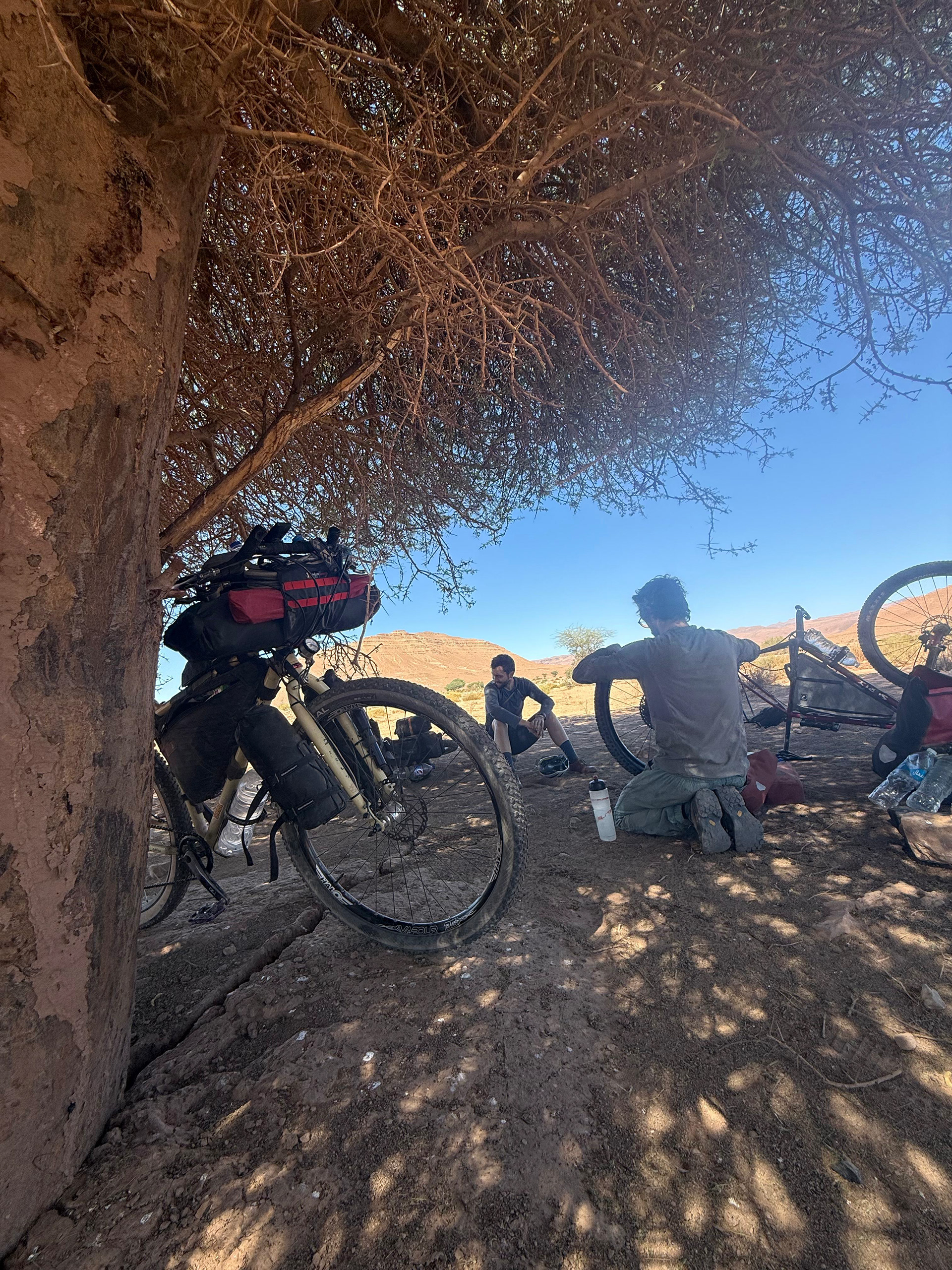 Die Straße rollt weniger gut als gedacht, vielleicht liegt es auch daran, dass es permanent bergauf geht. Basil hat heute auch nicht so viel Glück, sein Tubelesssetup am Hinterrad hat schon öfter Probleme gemacht, jetzt gibt es final auf. Er zieht also auch einen Schlauch ein, immerhin haben wir Schatten eines großen Baumes. Der Rest des Tages bis nach Ibn Yacoub verläuft unauffällig. Irgendwann kommen wir an eine Kreuzung, ein großes Schild zeigt links ist unser Weg, geradeaus kommt man auf der Straße direkt nach Agadir. Auch heute ist die Verlockung groß und ich wäre am liebsten weiter geradeaus gefahren.