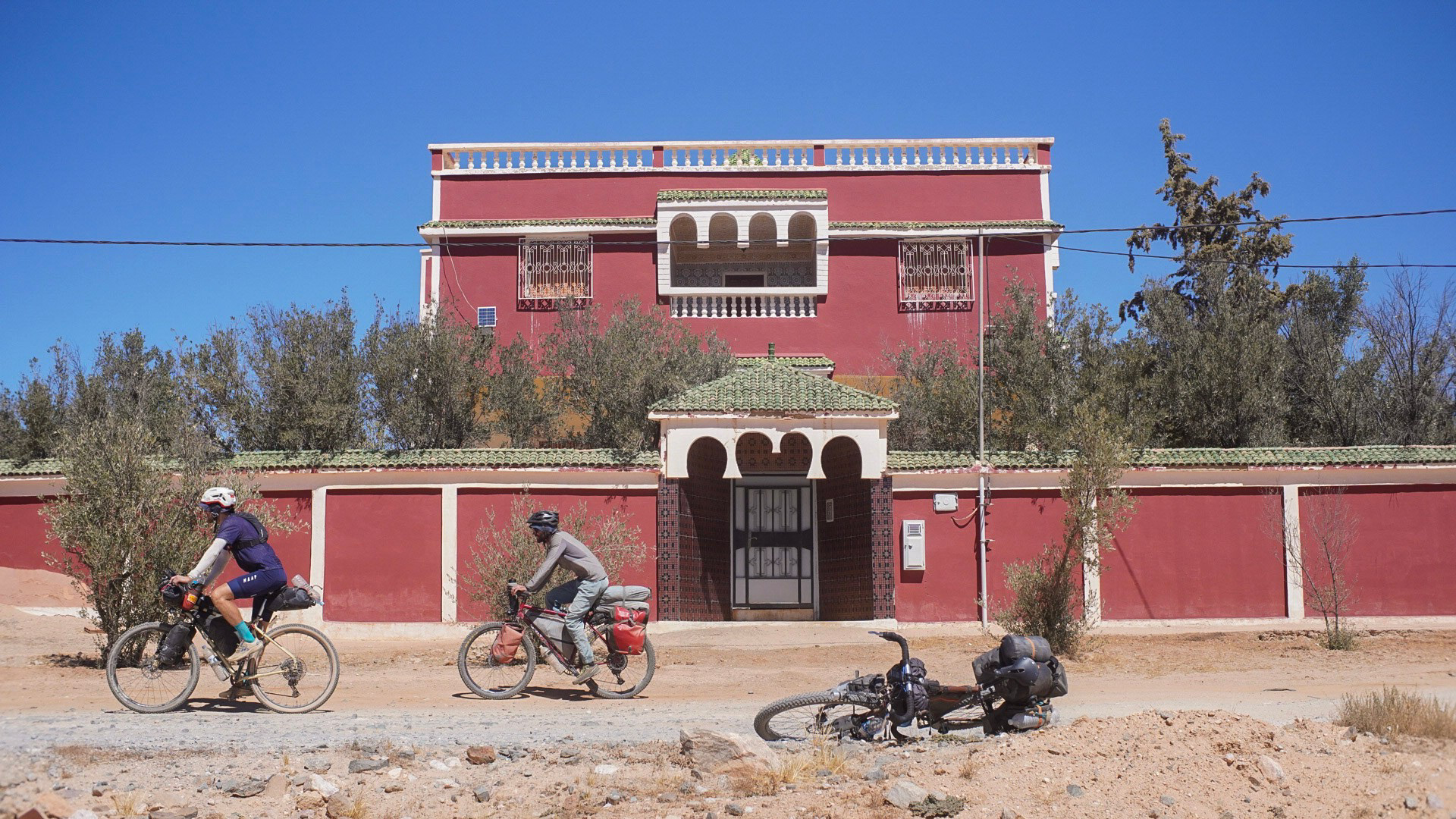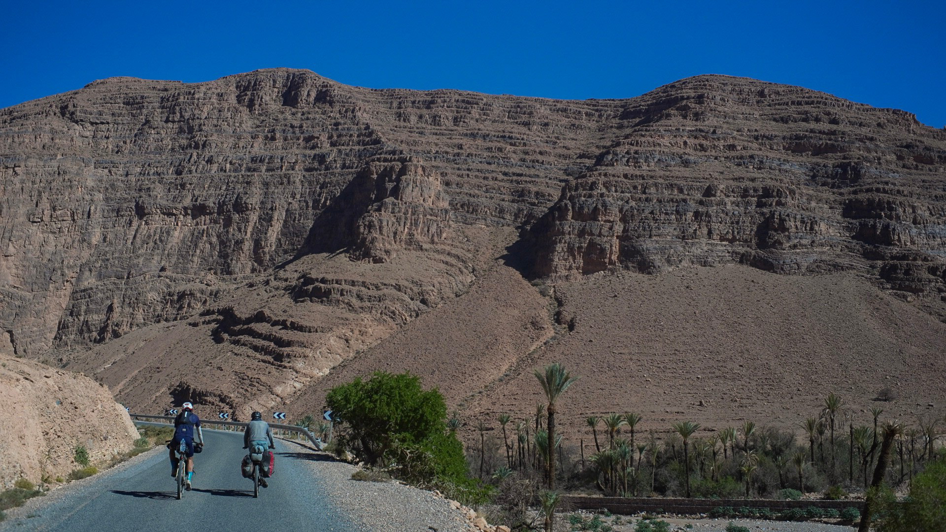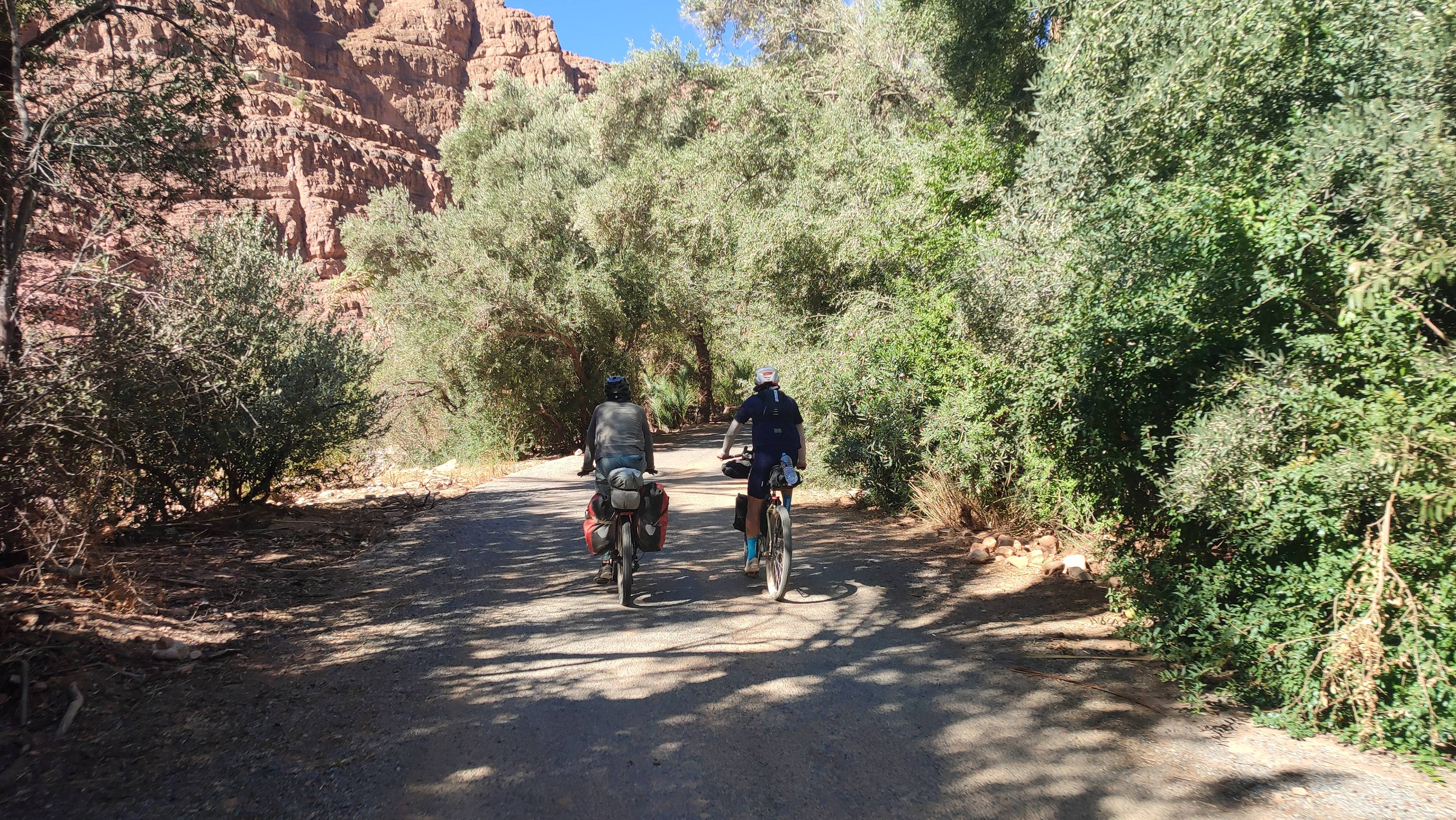 Ich habe richtig gut geschlafen, ganze 9,5 Stunden. Glücklicherweise habe ich meine Ohrstöpsel genutzt, der Muezzin hat sehr lange gerufen und außerdem saß ein bellender Hund die ganze Nacht vor unserem Fenster. So wurde mir das jedenfalls erzählt, ich habe nichts davon mitbekommen. Das Frühstück mit Brot, Butter und Marmelade ist dürftig. Wir schlagen trotzdem ordentlich zu. Der Tag wird heute länger und anstrengender als gestern. Die üblichen Liegestützen werden gemacht, diesmal erneut mit meiner Beteiligung. Danach machen wir uns auf den Weg, und das in ganz frischen Radklamotten, ein gutes Gefühl. Noch vor drei Tagen war ich überzeugt, dass ich heute in den Bus nach Agadir steigen würde, oder wenigstens die Straßenumfahrung um das heutige Offroad Stück nehmen würde. Heute fahre ich mit einem Grinsen mit den Jungs auf der Originalroute weiter. Der Weg führt uns durch ein Tal, es geht durch kleine Oasen, Dörfer. Dabei ist der Untergrund teilweise sogar noch Asphalt, dementsprechend kommen wir gut voran. So richtig merken wir dabei die Höhenmeter auch gar nicht und sind überrascht, wie gut wir uns fühlen, als wir den höchsten Punkt unseres Tages erreichen. Gleichzeitig beginnt auch wieder die Straße und beglückt uns mit einer gefühlt nicht endenden Abfahrt voller Spitzkehren. Wir müssen nur aufpassen, die Straßen sind eng, und die Marokkaner fahren gerne in der Mitte. Jede blinde Kurve macht mir daher etwas Sorgen. Wir kommen aber alle unbeschadet unten an und fragen uns, ob wir all diese Distanz wrklich vorher hochgefahren sind.