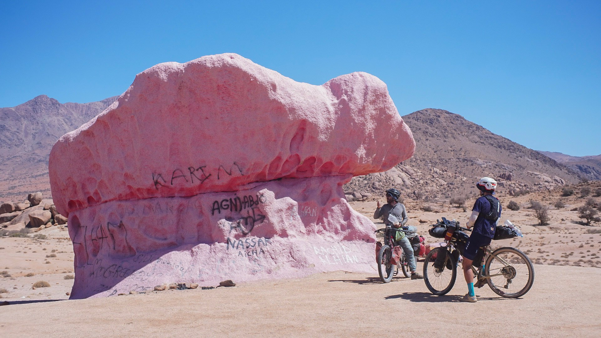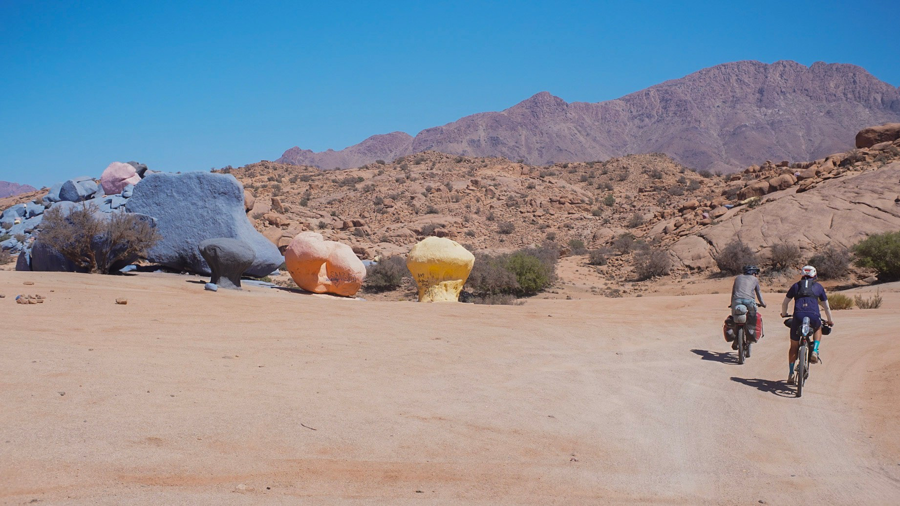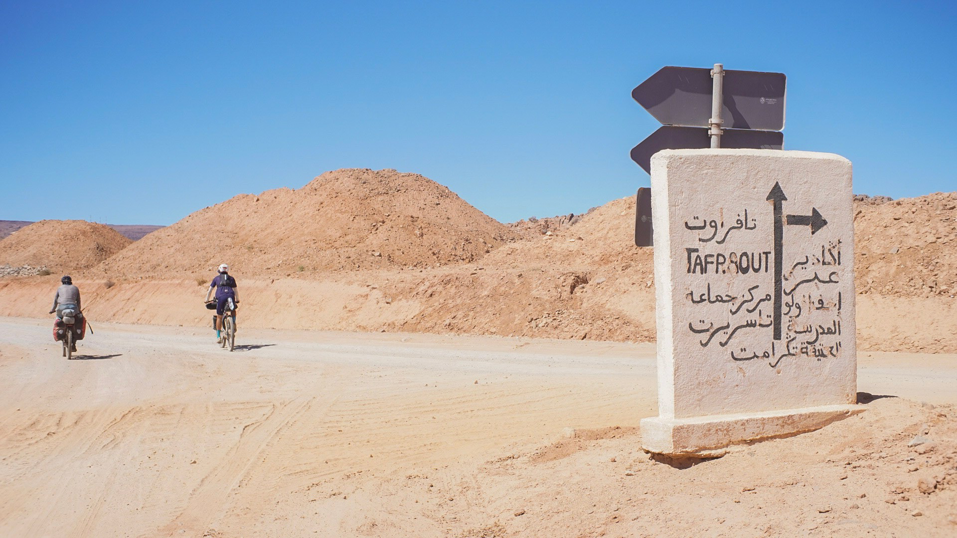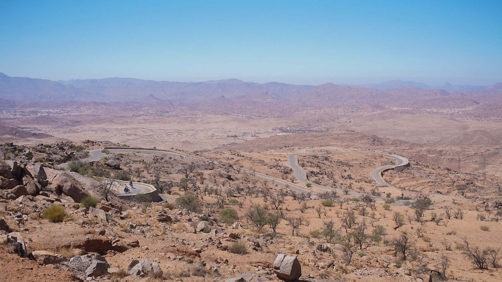 Ich habe richtig gut geschlafen, ganze 9,5 Stunden. Glücklicherweise habe ich meine Ohrstöpsel genutzt, der Muezzin hat sehr lange gerufen und außerdem saß ein bellender Hund die ganze Nacht vor unserem Fenster. So wurde mir das jedenfalls erzählt, ich habe nichts davon mitbekommen. Das Frühstück mit Brot, Butter und Marmelade ist dürftig. Wir schlagen trotzdem ordentlich zu. Der Tag wird heute länger und anstrengender als gestern. Die üblichen Liegestützen werden gemacht, diesmal erneut mit meiner Beteiligung. Danach machen wir uns auf den Weg, und das in ganz frischen Radklamotten, ein gutes Gefühl. Noch vor drei Tagen war ich überzeugt, dass ich heute in den Bus nach Agadir steigen würde, oder wenigstens die Straßenumfahrung um das heutige Offroad Stück nehmen würde. Heute fahre ich mit einem Grinsen mit den Jungs auf der Originalroute weiter. Der Weg führt uns durch ein Tal, es geht durch kleine Oasen, Dörfer. Dabei ist der Untergrund teilweise sogar noch Asphalt, dementsprechend kommen wir gut voran. So richtig merken wir dabei die Höhenmeter auch gar nicht und sind überrascht, wie gut wir uns fühlen, als wir den höchsten Punkt unseres Tages erreichen. Gleichzeitig beginnt auch wieder die Straße und beglückt uns mit einer gefühlt nicht endenden Abfahrt voller Spitzkehren. Wir müssen nur aufpassen, die Straßen sind eng, und die Marokkaner fahren gerne in der Mitte. Jede blinde Kurve macht mir daher etwas Sorgen. Wir kommen aber alle unbeschadet unten an und fragen uns, ob wir all diese Distanz wrklich vorher hochgefahren sind.