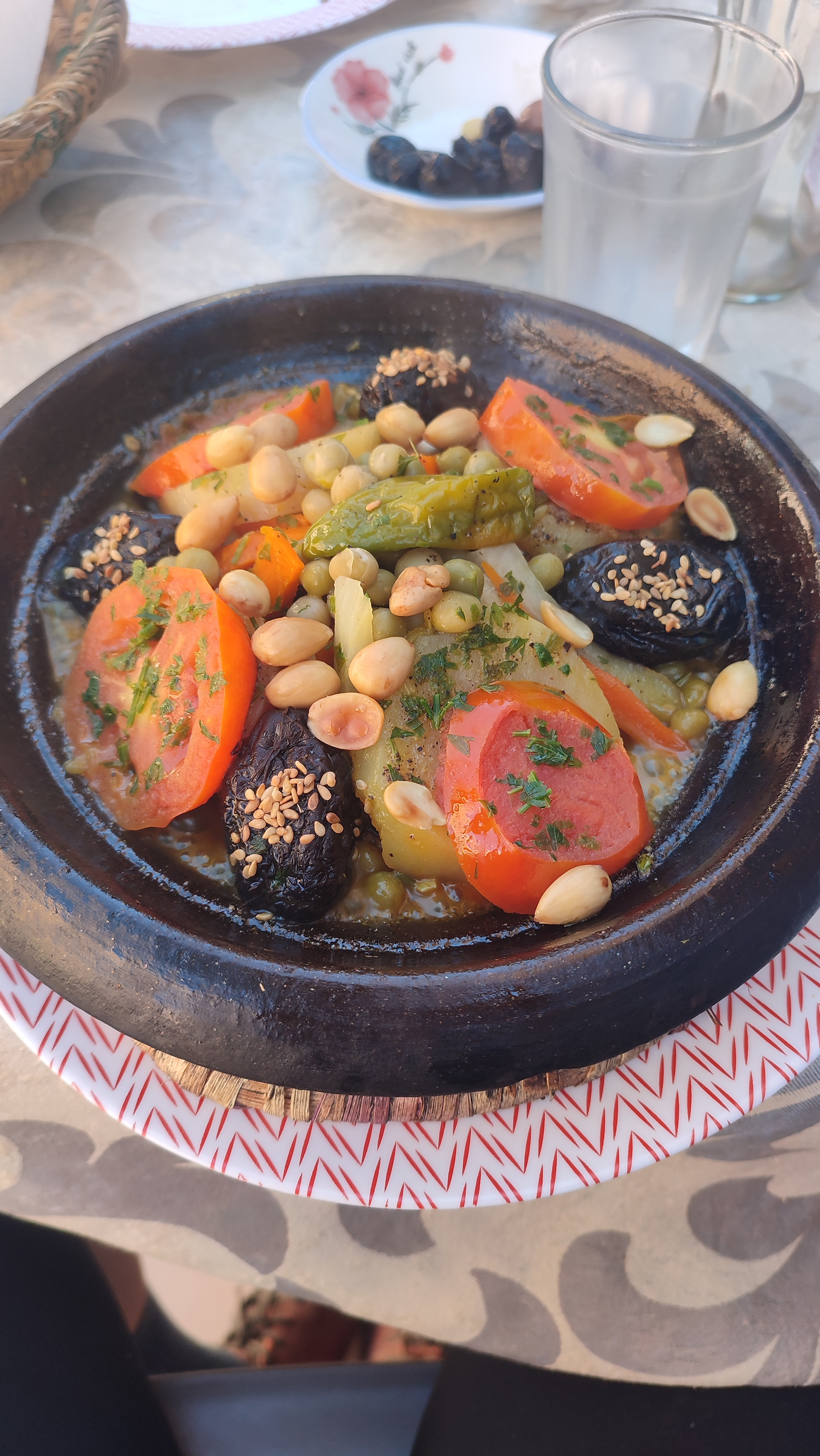 Weiter geht es wieder außerhalb der hier plötzlich wirklich sehr guten Straße. Wir kommen an riesigen bemalten Steinen vorbei, wir fragen uns, wer sich diese ganze Arbeit gemacht hat. Gleichzeitig ärgern wir uns über die Menschen, die die ganzen bemalten Steine mit irgendwelchen Krakeleien wieder verschmutzen. Generell merken wir aber, dass wir wieder in der Zivilisation ankommen. Die Abstände zwischen den Dörfern werden kleiner und alle Häuser sind plötzlich deutlich schicker. Unser Mittagsstopp ist Tafraoute, wir essen in einem schicken Restaurant zu Mittag. Es gibt mal wieder Tajine, diesmal ist sie wirklich ein Highlight, sehr viel verschiedenes Gemüse, gut gewürzt und sogar Pflaumen und Nüsse darin. Trotzdem bin ich froh, bald mal wieder etwas anderes zu essen. Das wahre Ausmaß der Stadt bemerken wir aber erst, als wir anfangen, unsere Abend Besorgungen zu machen. Es ist viel größer als gedacht und unsere Strategie, am erst besten Minimarkt einzukaufen, gar nicht so sinnvoll. Es gibt Supermärkte hier, und sogar frisches Obst und Gemüse. Wir können unseren Augen kaum trauen. Wir unterhalten uns noch länger mit einem jungen Marokkaner. Er hat Tourismus Wirtschaft studiert, aber findet jetzt keinen Job. Er ist unzufrieden über die Regierung und wie sie die Jugend behandelt. Am Ende will er Geld von uns.