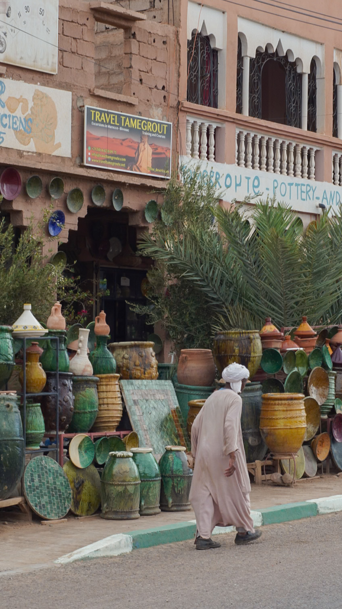 Der Host ist lustig, ich habe bisher noch keinen Rastafari Marokkaner gesehen, unter den Dreadlocks und dem Turban muss es super heiß sein. Wir beziehen die Wohnung im Hippie Style und freuen uns über die lauwarme Dusche. Etwas erfrischt ziehen wir direkt wieder los, um Vorräte für die Reise durch die Sahara einzukaufen. Übernachten werden wir in Wüsten Camps, dazwischen gibt es jedoch keine Möglichkeiten, irgendetwas einzukaufen. Wassermengen werden diskutiert, und Basil deckt sich mit Chips für eine Woche ein. Zurück im Haus, wird mir klar, warum die Böden so federn. Während die Wände aus Ziegeln gebaut wurden, bestehen die Böden lediglich aus wenigen Holz Latten und primär Bambus Stangen, bedeckt mit Lehm. Ich bin froh, wenn wir das Haus und die zweite Etage unbeschadet wieder verlassen.