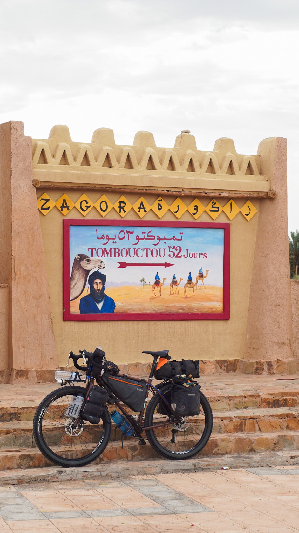 Das früheste Frühstück, das wir bekommen konnten, war halb 7. Ich bin froh, nicht ganz so früh aufstehen zu müssen und mit den üblichen Verhandlungen, wann aufgestanden wird, erst morgen starten zu müssen. Wir steigen gegen 9 Uhr aufs Rad, ein Fehler, wie sich später noch zeigen sollte. Aber erstmal fahren wir bei bewölktem Wetter und akzeptablen Temperaturen los. Am Ausgang der Stadt steht ein Schild: 52 Tage nach Timbuktu. Ein Zeichen der Bedeutung der Region. Früher, als Karawanen durch die Wüste zogen, war Zagora eine taktisch günstig gelegene Stadt, von der Karawanen in alle Richtungen der Sahara starteten.