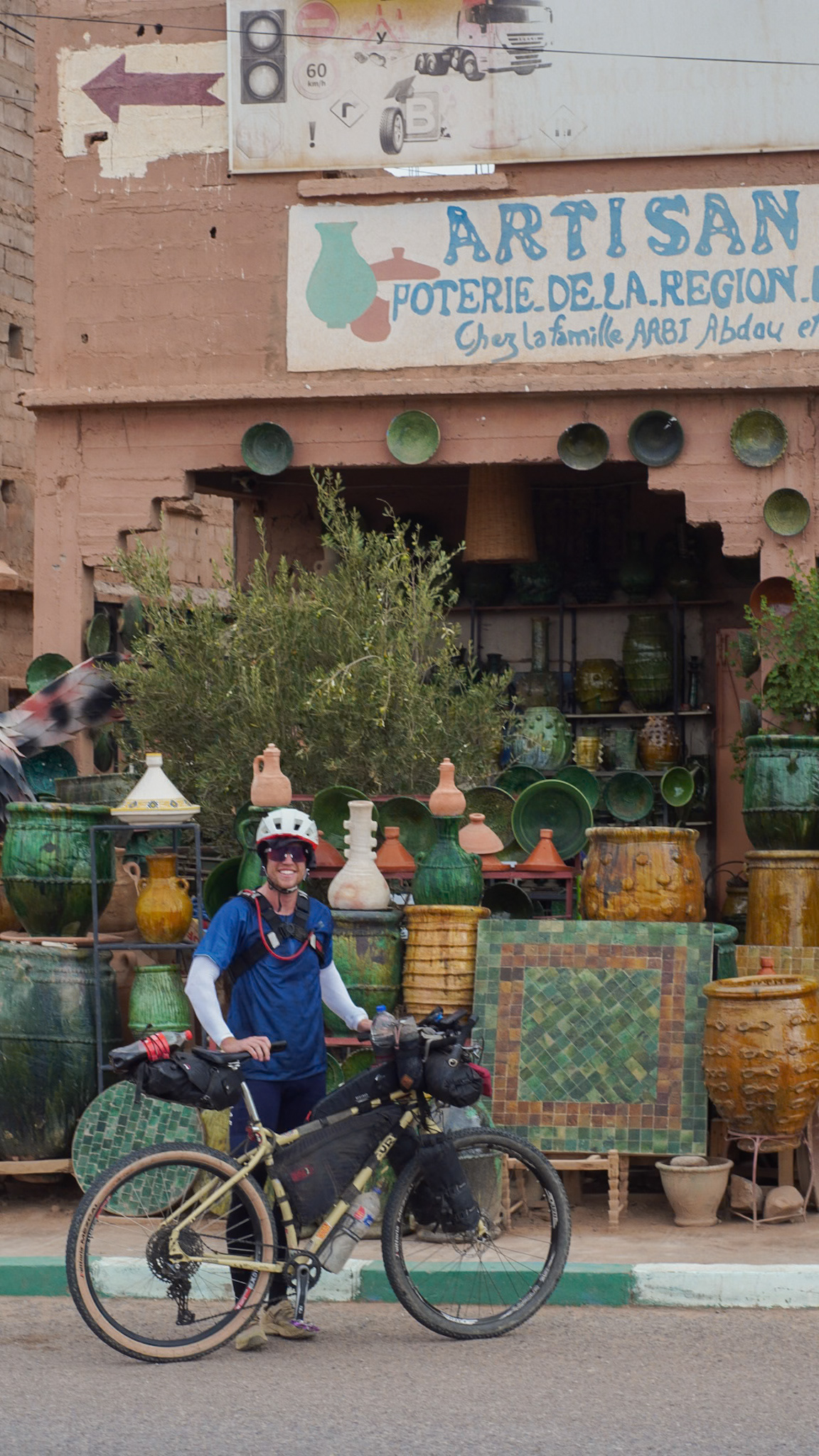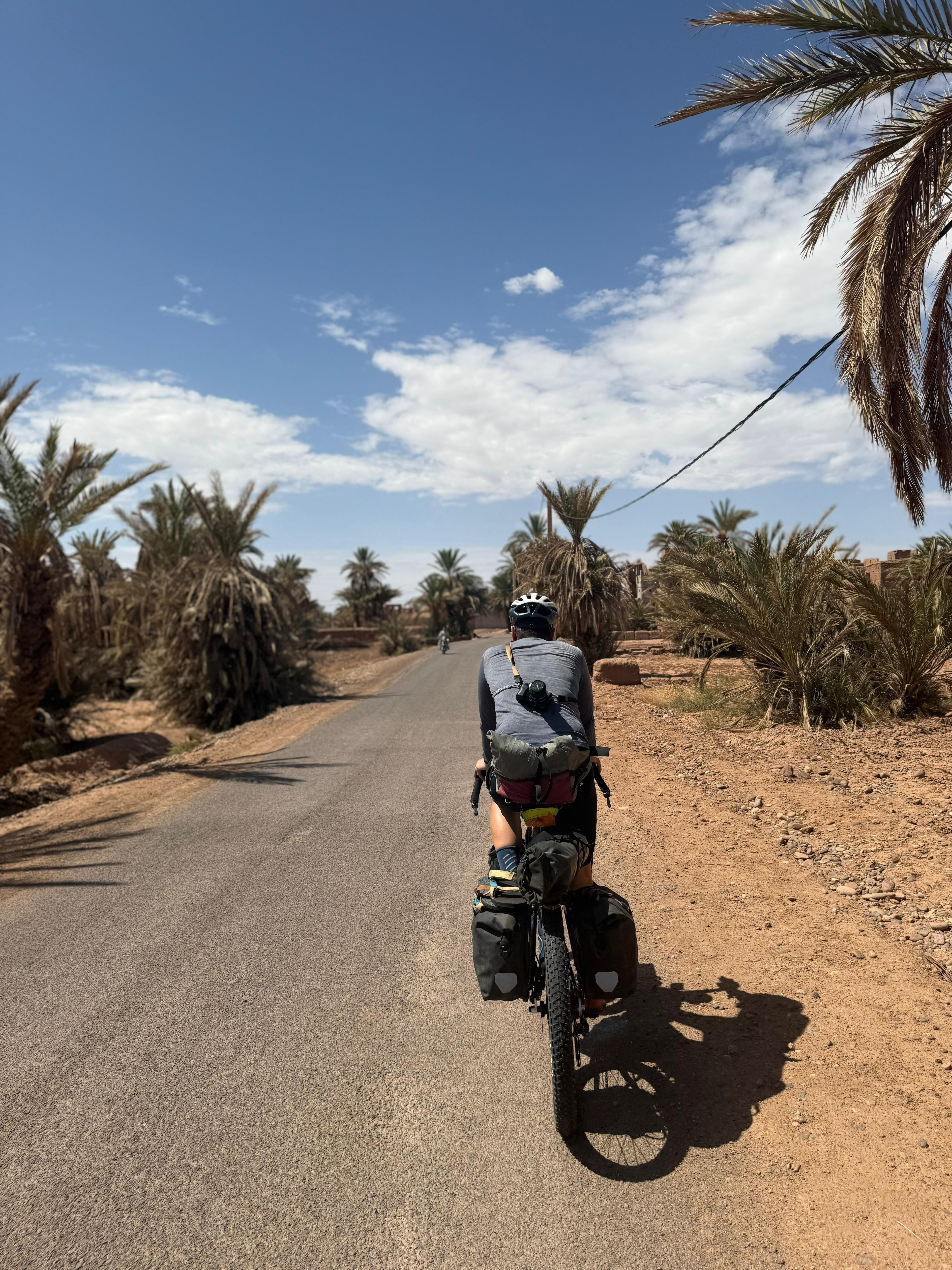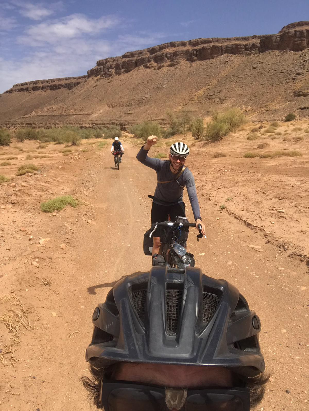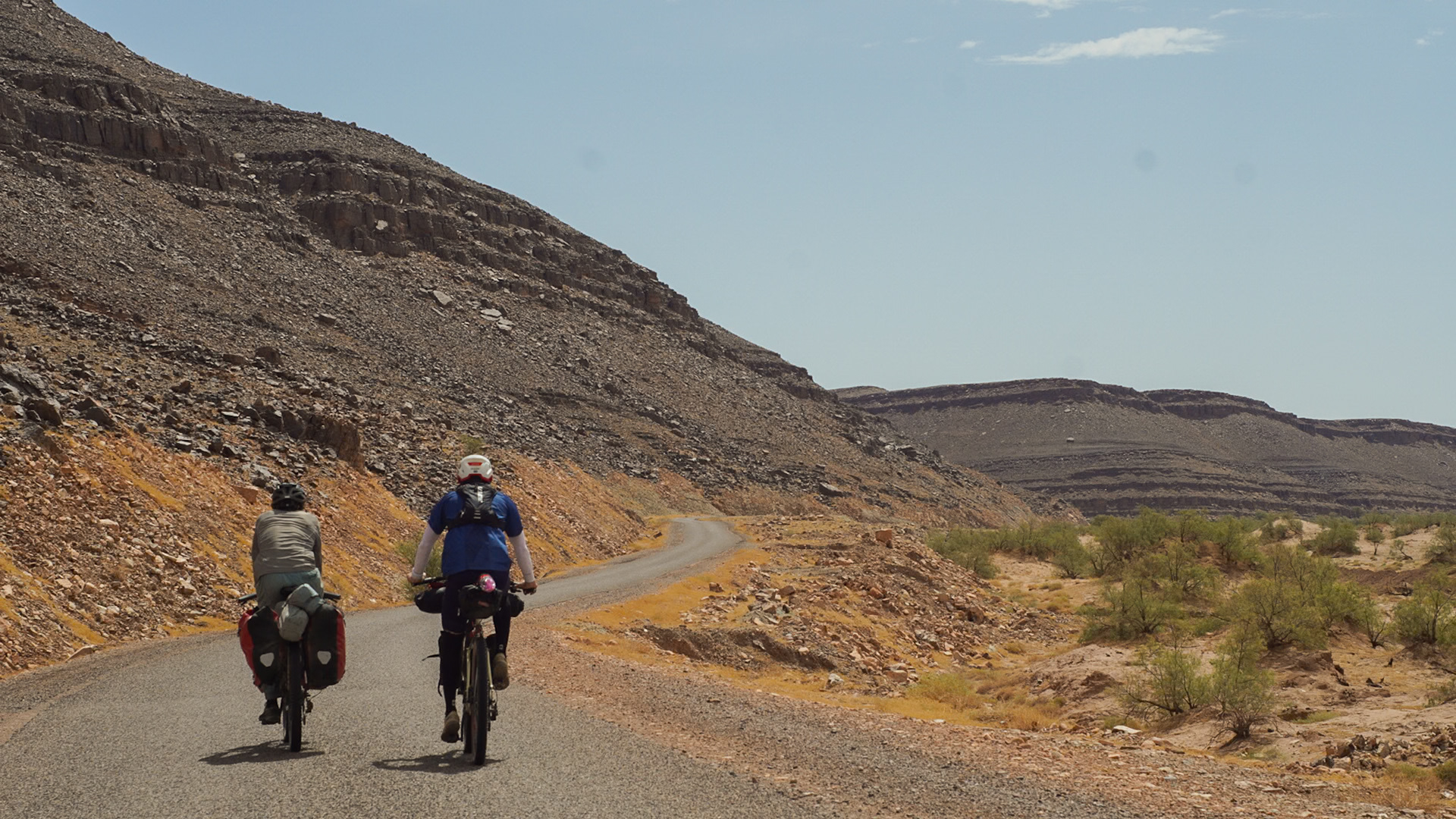 Bei der Hälfte der Strecke treffen wir Basil wieder. Gemeinsam essen wir unsere Sandwiches und machen uns danach gemeinsam auf den weiteren Weg. Jack und ich wollen jetzt doch auf der Original Route bleiben, um ein paar der Höhenmeter zu sparen. Schnell merken wir, dass das vielleicht doch noch keine so gute Idee ist, und wechseln nach etwas Schieben zurück auf die Straße. Die letzten 20 Kilometer tun richtig weh, es ist plötzlich super heiß. Mein Tacho zeigt 42 Grad und obwohl ich eigentlich gar nicht hart in die Pedalen trete, steigt mein Puls in Bereiche, in denen ich mich sonst eher in Intervall Einheiten bewege. Endlich biegen wir in Richtung Tagounite ab, und plötzlich haben wir auch keinen Gegenwind mehr. Wir halten an einem kleinen Kiosk, ich packe mein rostiges Französisch aus und kaufe kaltes Wasser und eine Cola. Die Cola-Flasche riecht komisch, ich will aber einfach nur etwas Kaltes mit Zucker haben. Wir sprechen mit zwei Lehrern, die aus einer Stadt an der Küste für zwei Jahre in das Dorf versetzt wurden, sie sind auch etwas überfordert mit der Hitze.