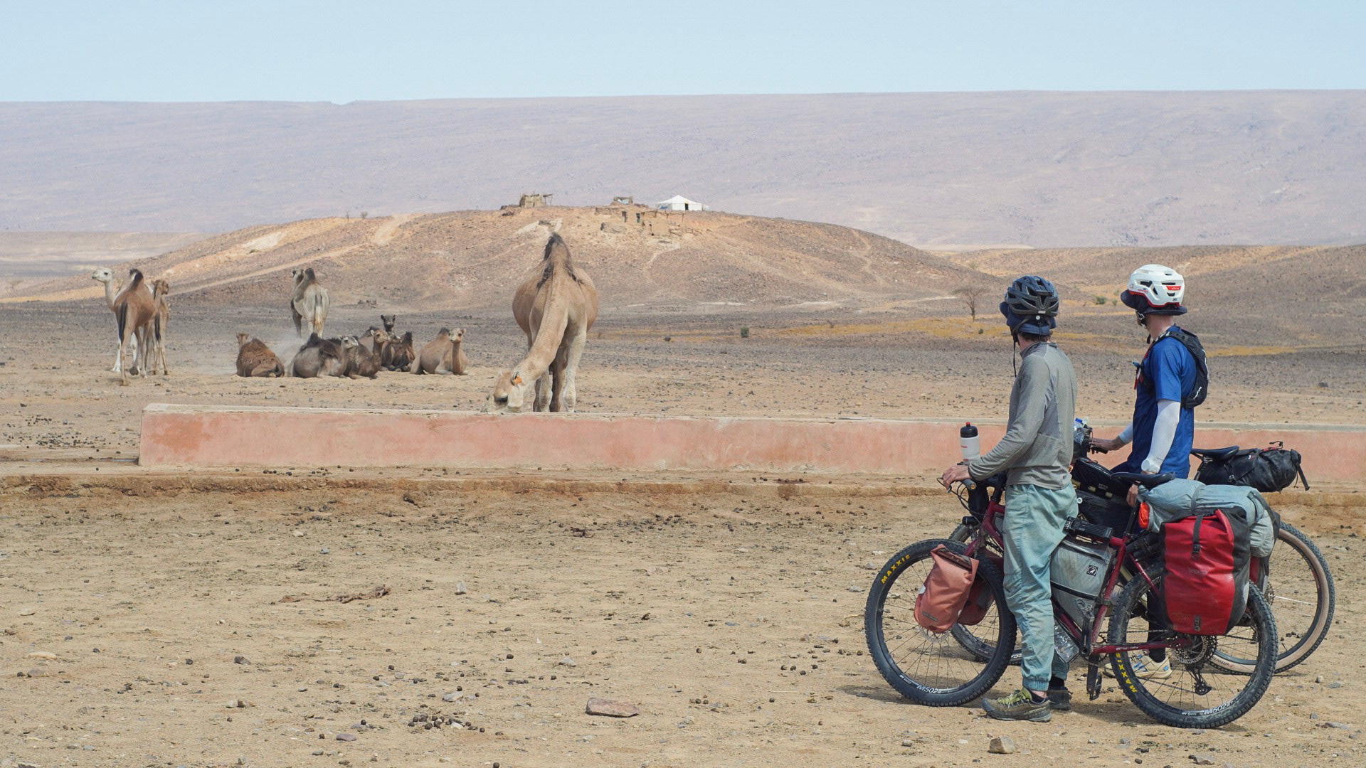 Die Stimmung ist dennoch gut, nur mein Hintern tut von den letzten Tagen etwas weh. Mit der Zeit wird der Untergrund immer besser, und bald rollen wir ziemlich komfortabel Richtung heutiger Unterkunft. Bevor wir uns von der Piste verabschieden, kommen wir noch an einem kleinen Brunnen vorbei. Hier halten ein paar Nomaden ihre Dromedare. Basil ist mutig und geht auf die Herde zu, um eines zu streicheln. Er ist erfolgreich, ein Dromedar bleibt stehen und lässt sich streicheln. Als ich mein Glück auch probiere, hauen alle ab. Etwas weiter sitzt ein weiteres Dromedar auf dem Boden. Es lässt das Streicheln über sich ergehen, Aufzustehen scheint unangenehmer zu sein.