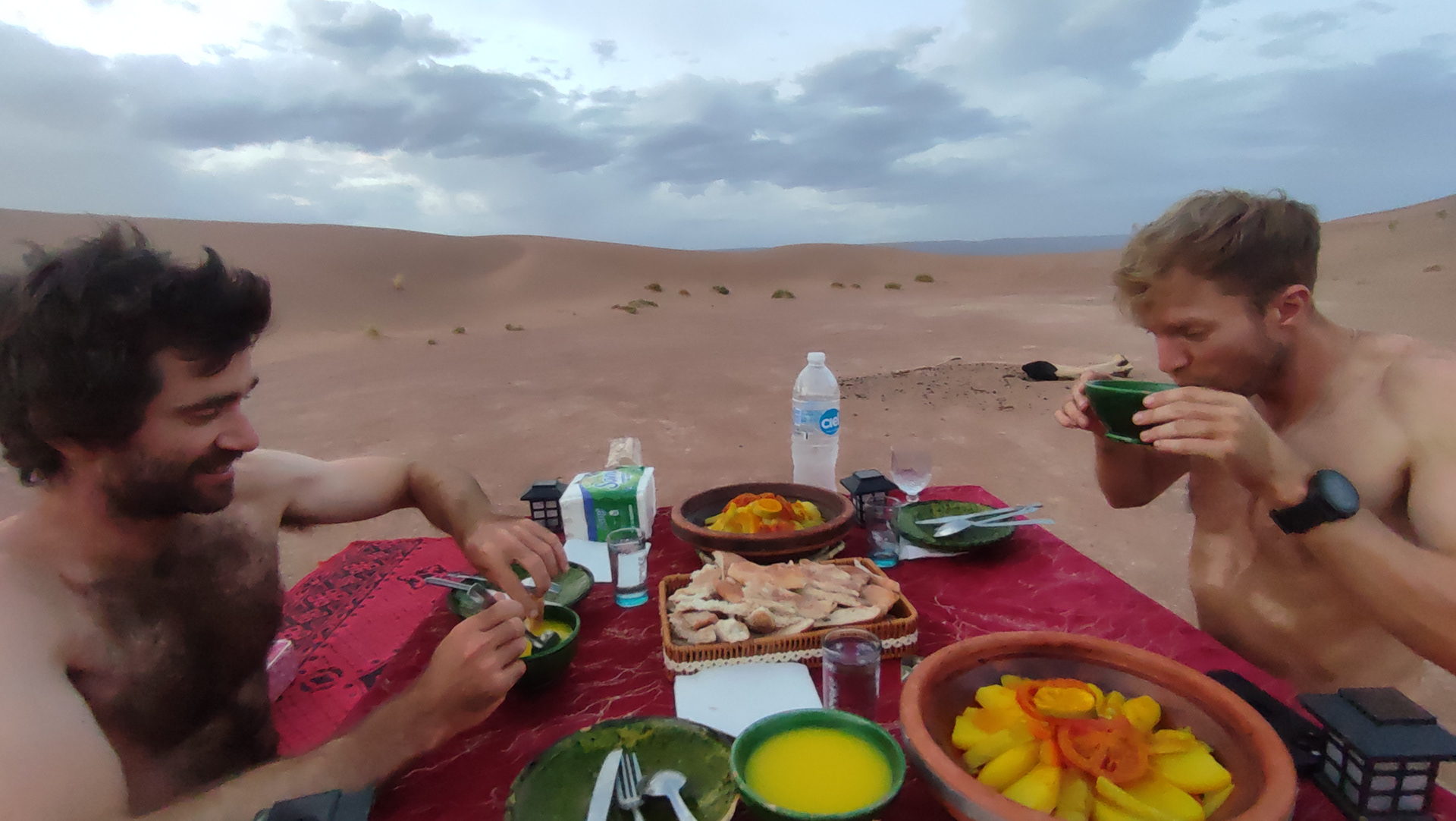 Unser Host ist witzig, ich verstehe relativ viel der Unterhaltung von ihm und Basil. Jack macht Musik auf dem Handy an, und wir vier machen ein Nickerchen im Schatten. Der Wind ist immer noch wie ein Fön. Es gibt Tee, Cola und kaltes Wasser. Der Tag nimmt doch noch ein versöhnliches Ende. Abends gibt es zum vierten Mal Tajine in Folge, morgen wollen wir dann mal etwas anderes. Einen Schonungstag mit wenigen Höhenmetern habe ich morgen noch, danach geht es ins Atlas Gebirge mit einem Anstieg von über 1100 Höhenmetern. Immerhin wird es dort hoffentlich etwas kühler.