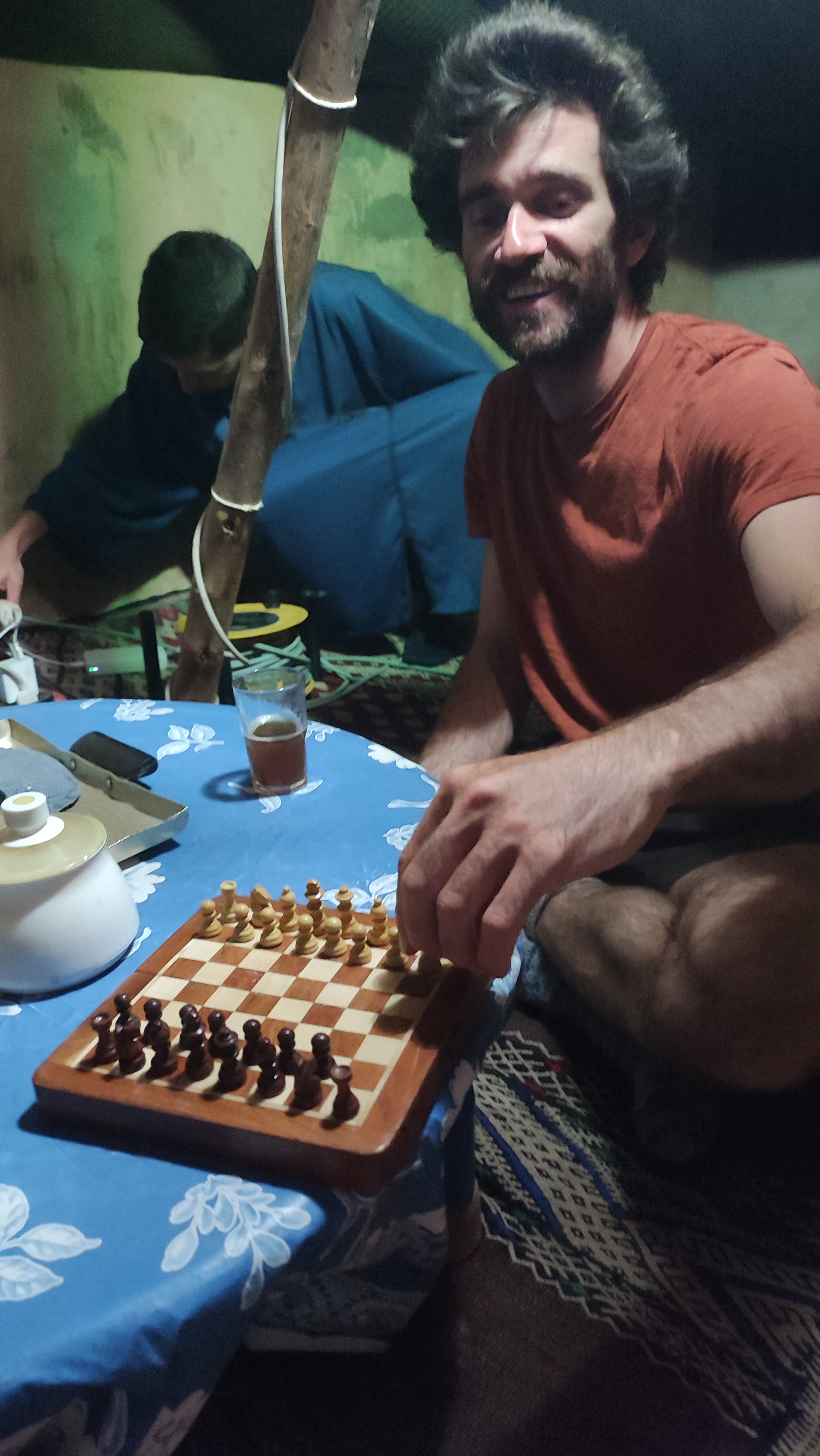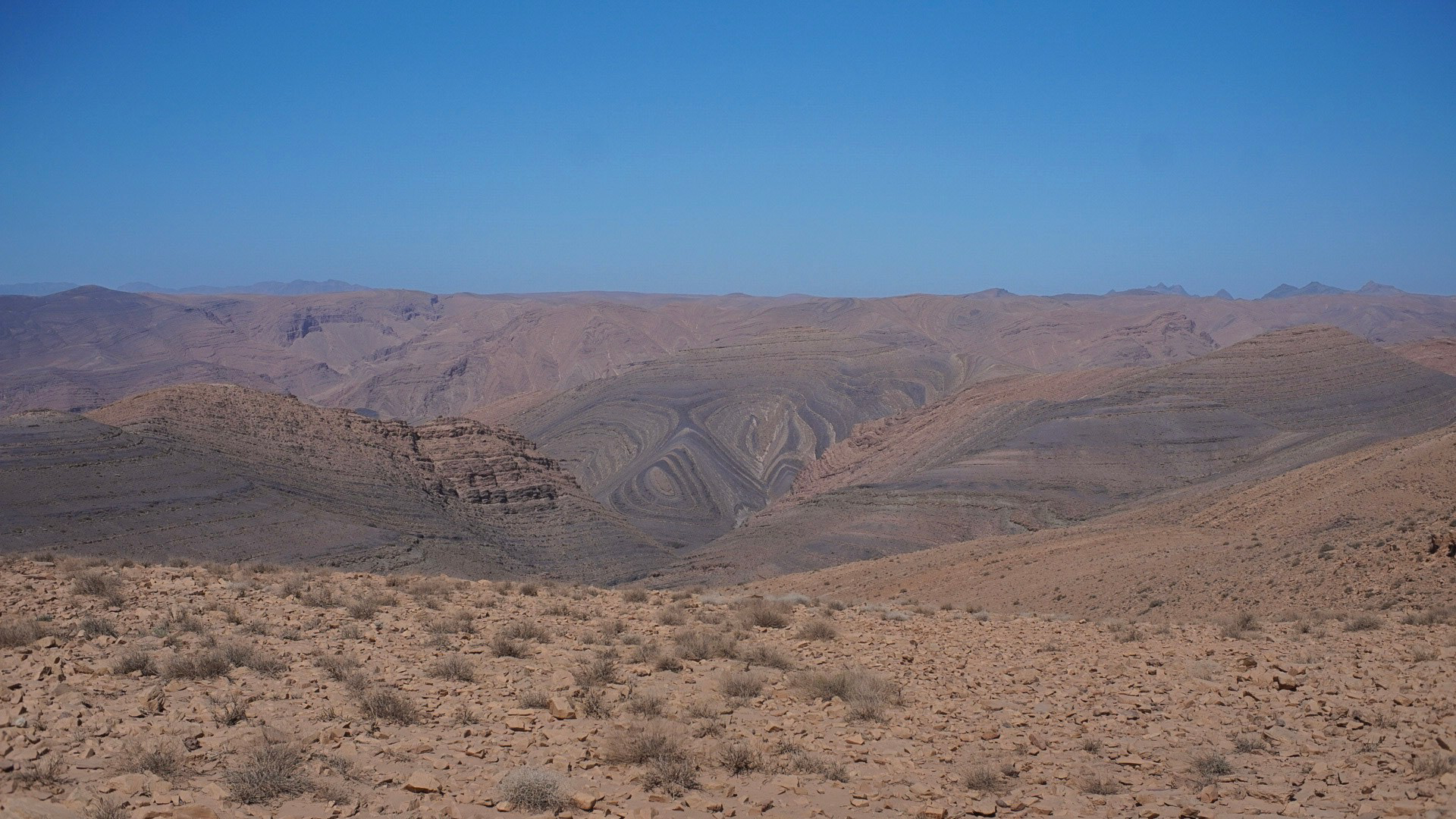 Plötzlich stehen wir auf einer stark verdichteten Schotterstraße, das Fahren ist plötzlich wirklich leicht. Das Rad läuft, vor allem bergab rolle ich den anderen immer weg, ein paar gerne genommene Extra Meter Vorsprung für die Anstiege. Wir müssen hier in einer Art Bergbaugegend sein, immer wieder kommen ordentlich beladene LKWs an uns vorbei gefahren. Wir sind immer noch mitten in den Bergen. Umso mehr verwundert uns die alte Dame, die auf einmal mitten im Nirgendwo am Wegesrand auftaucht. Sie hat einiges an Taschen dabei und scheint anscheinend auf eine Mitfahrgelegenheit zu warten. Je weiter wir noch fahren, desto verwirrter sind wir, wie sie dort hingekommen ist. Bald beginnt für uns aber eine fünf Kilometer Abfahrt. Sie ist perfekt zu fahren, ich glaube, so schnell war ich Offroad noch nie unterwegs. Am Straßenrand, halb im Graben, hängt ein ausgebrannter Pickup, eigentlich ein gutes Fotomotiv, aber ich kann jetzt nicht anhalten. Die Minenstraße bringt uns direkt in einen heftigen Asphaltanstieg, uns ist das egal, nur noch 10 Kilometer bis zur Unterkunft. Wir träumen alle bereits von der Dusche, heute ist Tag Acht ohne. Die Träume halten an, bis wir plötzlich rechts von der Asphaltstraße abbiegen. Schwer zu beschreiben, was uns hier erwartet, nur Weg kann man es eigentlich nicht nennen: Grober Fels, kaum fahrbar, umgeben von losem Geröll. Wir kommen kaum noch voran, zusätzlich ist es durch unsere lange Abfahrt plötzlich richtig heiß. Die Sonne röstet uns noch einmal richtig durch, während wir uns einen halbwegs fahrbaren Weg suchen. Besonders interessant wird die anschließende Abfahrt. Wir hatten bereits haarige Stellen, hier habe ich das erste Mal richtig Angst auf dem Rad. Alles rutscht, klackert und bewegt sich. Ein Fehler hier würde richtig böse enden, und das Ganze auf unseren ungefederten, beladenen Rädern. Ich bin doch froh, als es vorbei ist, und justiere erstmal meine Bremsen nach. Die Beläge sind in den letzten zwei Wochen ziemlich verschlissen. Zum Glück geht es ab jetzt nicht mehr technisch weiter, und wir sind bald an der Unterkunft, ein buntes, kleines Juwel in der restlichen Marslandschaft. Es gibt sogar ein kleines Berber-Museum. Die Dusche ist ein absoluter Traum, der Boden füllt sich mit braunem Wasser, während ich mir den Dreck des Tages und wahrscheinlich auch ein paar Schichten der Tage davor abwasche. Ich fühle mich wie neu geboren. Anschließend geben wir noch unsere Radsachen zum Waschen ab. Wir haben alle etwas Mitleid, eine unserer Socken reicht schon, um das gesamte Grundwasser des Dorfes zu vergiften, was eine gesamte Trommel Radklamotten von drei stinkenden Radfahrern mit der Waschmaschine anstellen werden, will ich mir gar nicht vorstellen.