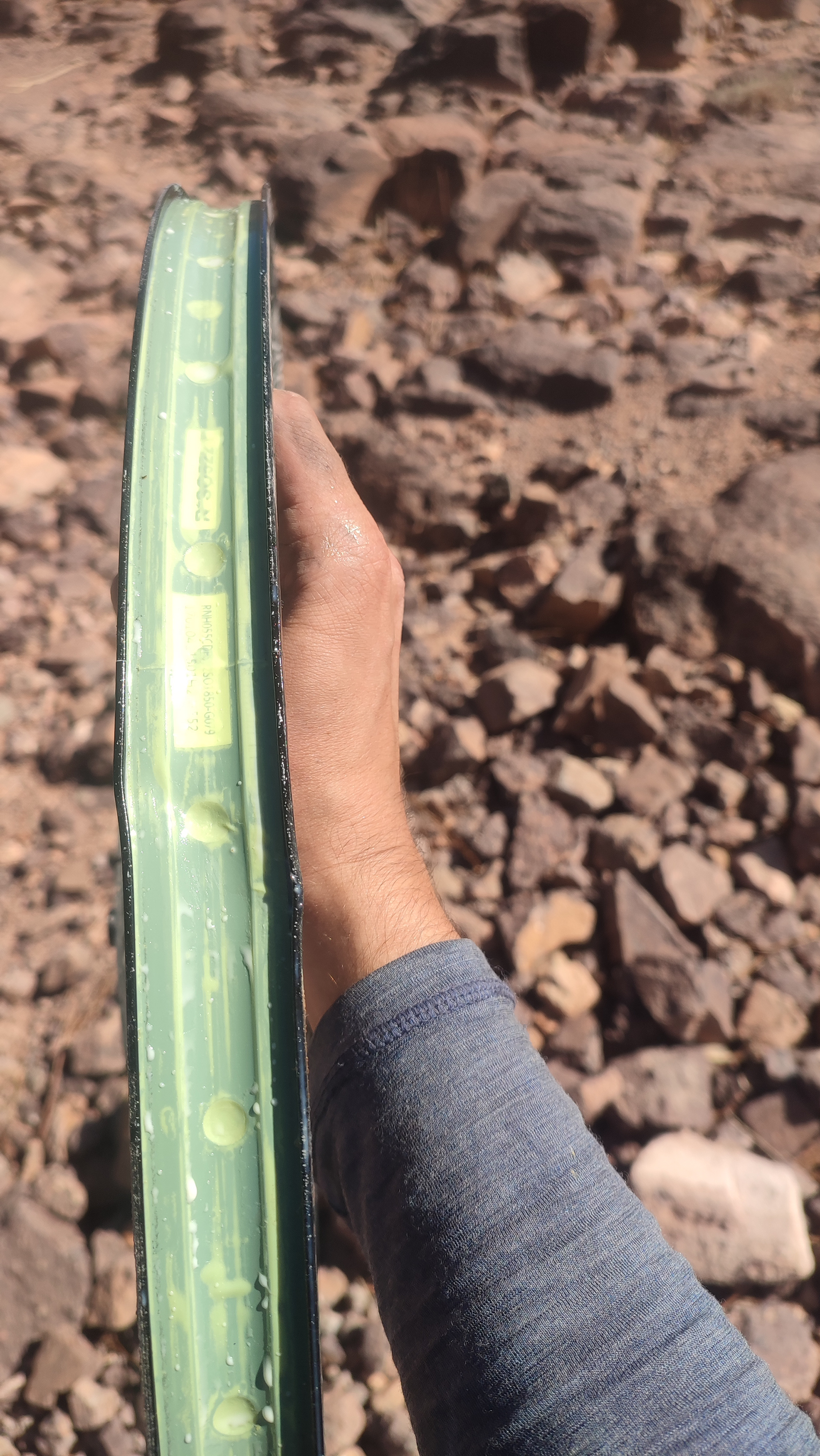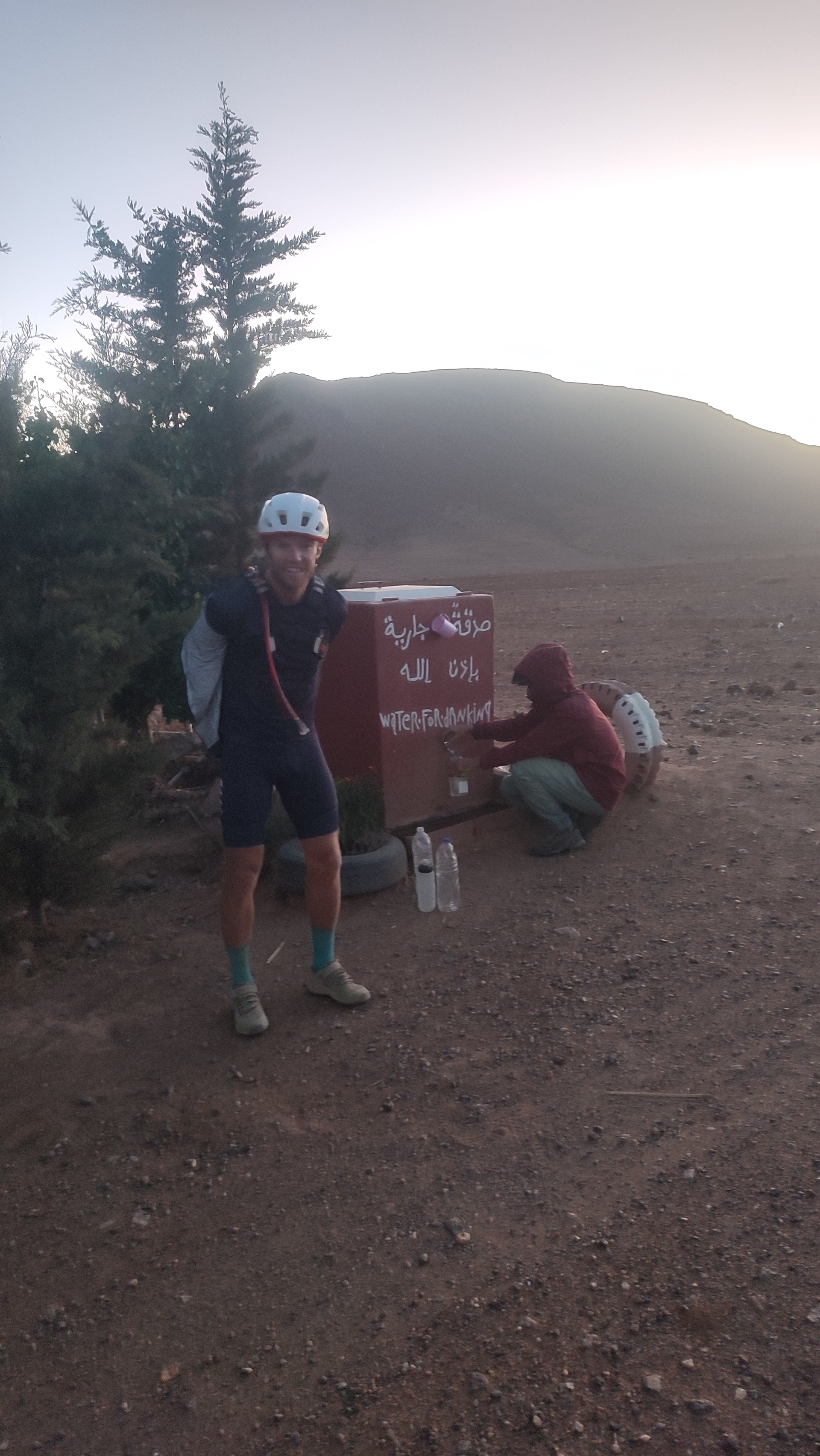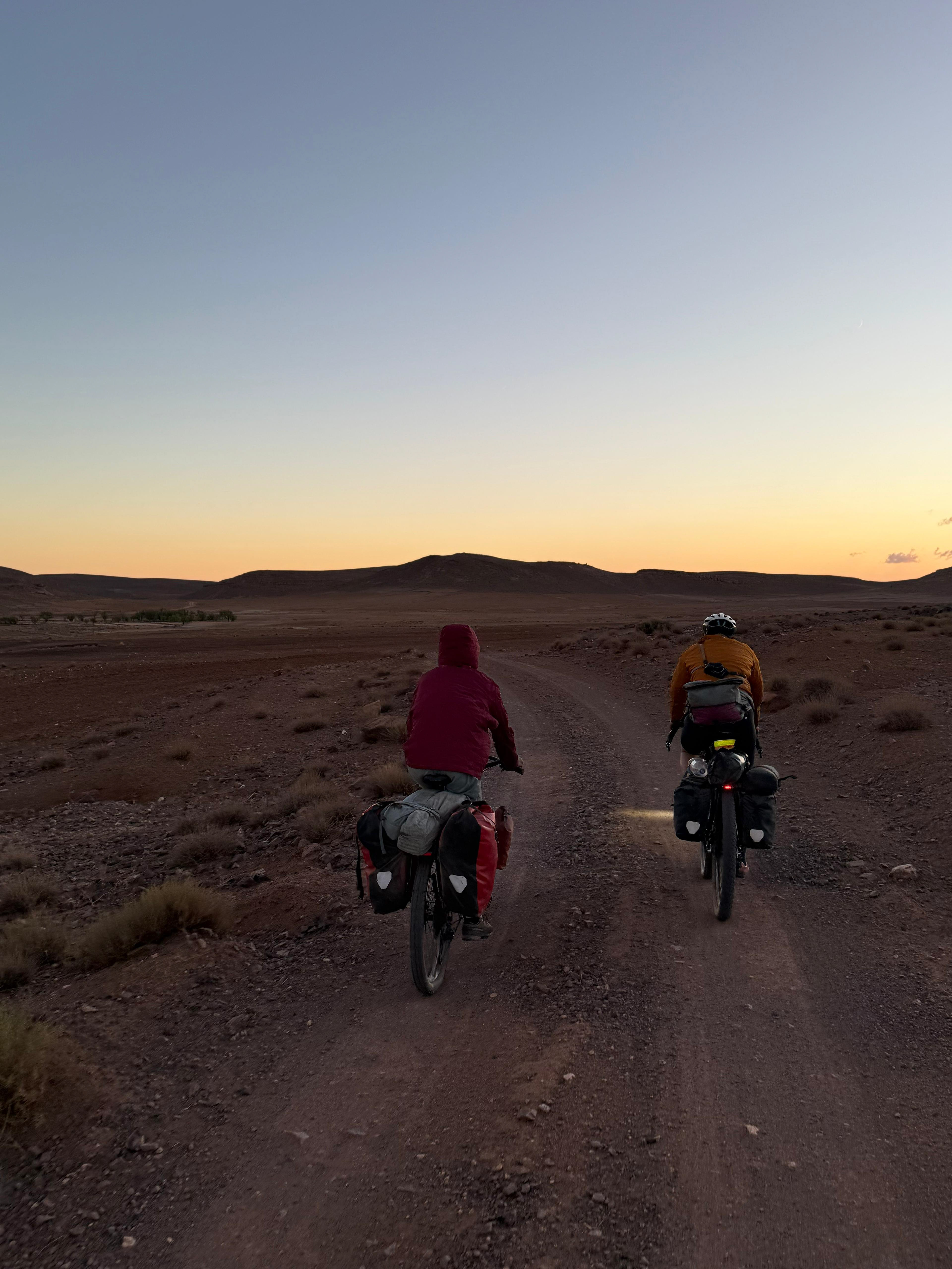 Danach geht es wieder bergauf, und das lange. Bis zu unserem Ziel, einer Herberge in einem kleinen Dorf, wären es 82 km mit 1400 Höhenmetern gewesen, wovon jedoch die ersten 15 km flach und die letzten 25 km bergab sind. Die Anstiege sind also ziemlich dicht gesetzt und es geht quasi nur noch bergauf. Die Untergründe sind wechselhaft, nur Asphalt gibt es natürlich keinen. Je länger wir fahren, desto schlechter werden die Wege und desto geringer meine Hoffnungen, heute noch vernünftig duschen zu können. Nach drei Tagen hätte ich es wirklich nötig. Stattdessen bekomme ich: Wasserknappheit, Müdigkeit und einen Weg entlang eines ausgetrockneten Flusslaufs. Immer wieder kreuzen wir das steinige Flussbett. Inzwischen bin ich müde und traue meinen Reflexen nicht mehr. Ich steige daher oft ab und schiebe, um nicht zu stürzen. Die Routine besteht aus: durch Flussbett schieben, aufsteigen, 50-100 Meter bergauf über einen rauen, kaum fahrbaren Weg zu fahren, nur um wieder abzusteigen und ein Stück runter in den Fluss zu schieben. Die Sonne sinkt immer tiefer und ich frage mich, wie schon öfter auf dieser Reise, warum ich mir das alles antue. Nicht nur so viele heile Fahrradteile, sondern auch Nerven, wie diese eine Woche hat mich die gesamte Singapurreise oder auch anderes in meinem Leben nicht gekostet. In dem Moment hasse ich es, beim Schreiben des Blogs bin ich mir aber sicher, würde man mich in einer oder zwei Wochen nochmal fragen, würde ich es wahrscheinlich ohne zu murren direkt wieder machen. Irgendwann lassen wir endlich den blöden Fluss hinter uns. Natürlich geht es weiter bergauf, und ich habe inzwischen kein Wasser mehr. Auf trockene Kekse als Energielieferanten habe ich ebenfalls keine Lust mehr, die äußerst süßen King Cookies, unsere Wahl der letzten Tage, würde ich ohne Wasser aber eh nicht herunterbekommen. Langsam geht inzwischen die Sonne unter, und mir wird kalt. Der Blick auf den Tacho verrät 16 Grad, dass ich nach der Sahara noch solche Temperaturen in Marokko erfahren würde, überrascht mich. Bis zum Wasser ist es aber immer noch weit und ich vertröste mich weiter. Wir können einfach nicht genau sagen, wann wir an Wasser kommen, und fahren daher weiter. Etwas anderes bleibt uns ja auch nicht übrig. Einen weiteren Anstieg später sehen wir in der Ferne die ersten grünen Bäume und Büsche. Erst sind wir nicht erfolgreich, es gibt hier kein Wasser. Beim zweiten Stopp immerhin die besten Äpfel, die ich je gegessen habe. Wir rollen weiter, kurz vor dem nächsten Dorf ist eine Eco/Bio Farm. Das Beste, direkt daneben ist ein großer Wasserspender, unsere Rettung. Wir füllen alles auf, was wir haben, inzwischen ist es komplett dunkel. Während ich noch mein Wasser filter, bevor es in die Flaschen kommt (ich will mich nicht schon wieder vergiften), untersuchen die Jungs die Farm. Anscheinend gibt es hier ein Café, das zwar geschlossen ist, aber davor genug Platz für unsere Zelte bietet. Es gibt ebenfalls eine WhatsApp Nummer. Die beiden sind dagegen, dort hin zu schreiben, ich fühle mich aber besser damit, dort Bescheid zu sagen, dass wir hier campen. Falls die Besitzer:innen uns besuchen kommen würden, würde ich den Smalltalk übernehmen. Aber jetzt nochmal weg von hier, wollen wir alle auch nicht. Ich bekomme lange keine Antwort, wir kochen erstmal. Es gibt die klassische Radreise: Linsensuppe, aber sie schmeckt gar nicht schlecht. Später bekommen wir ein Willkommen per Nachricht, da sind unsere Zelte aber bereits unter dem klaren Sternenhimmel aufgebaut und wir auf dem Weg in die Schlafsäcke.