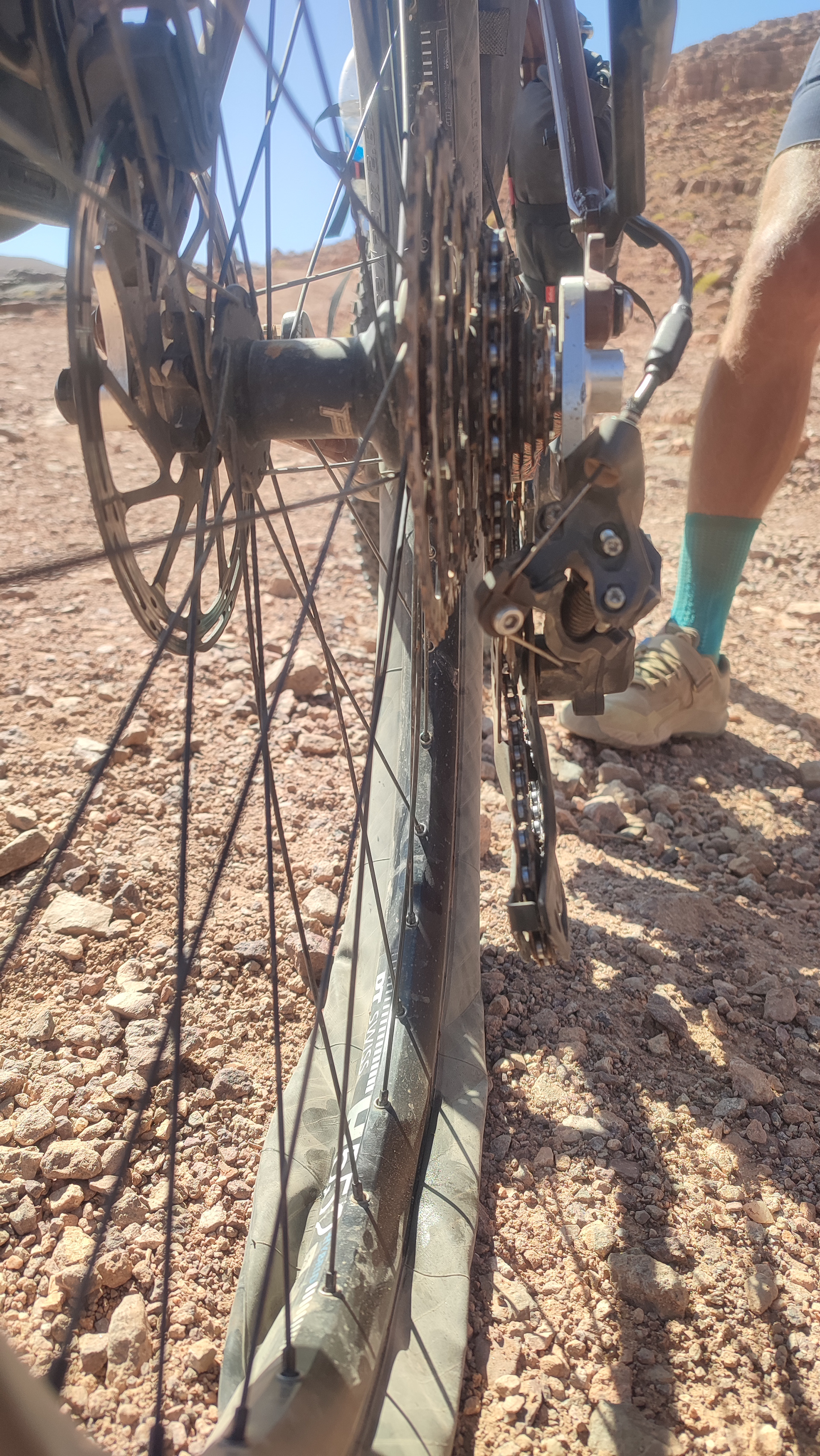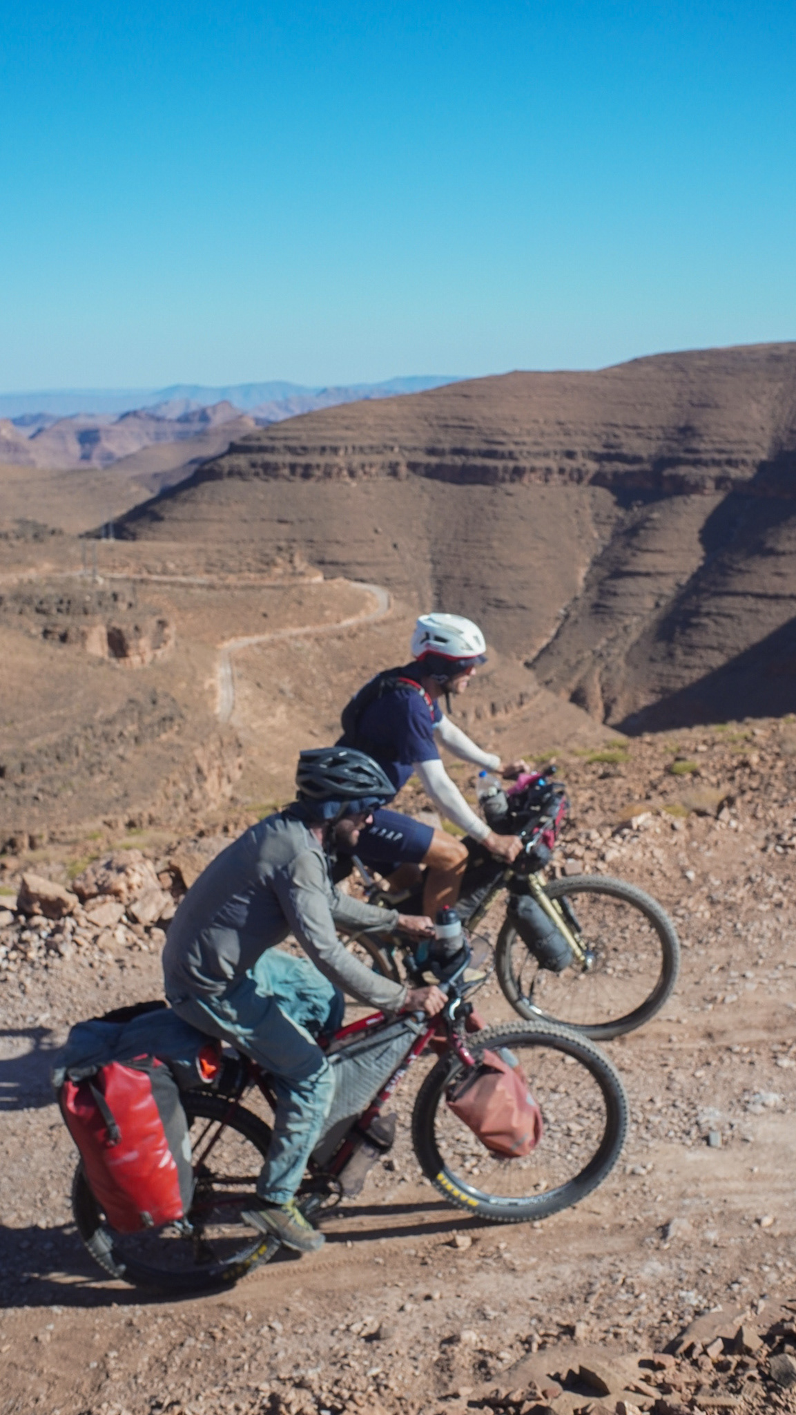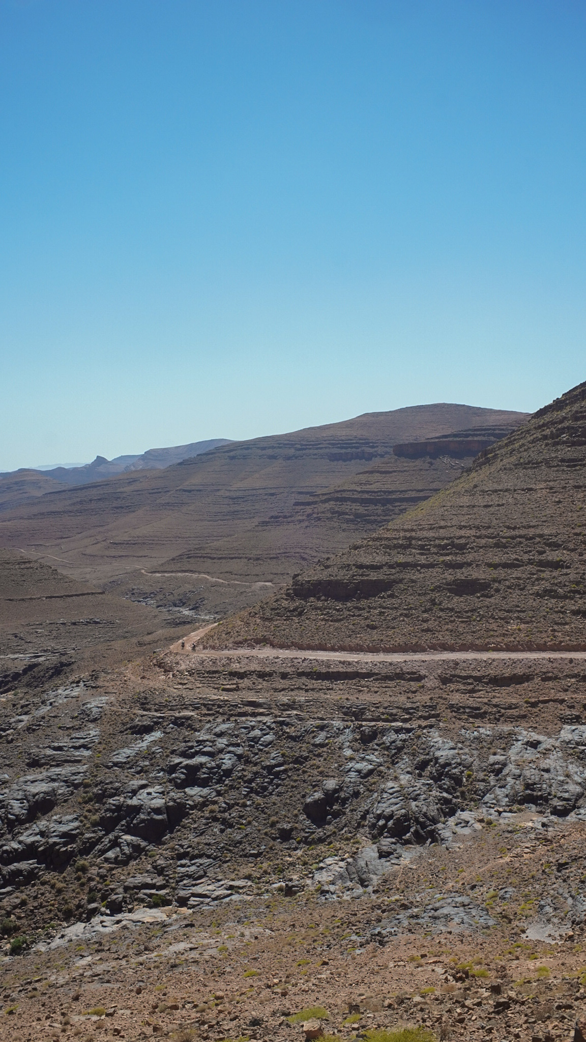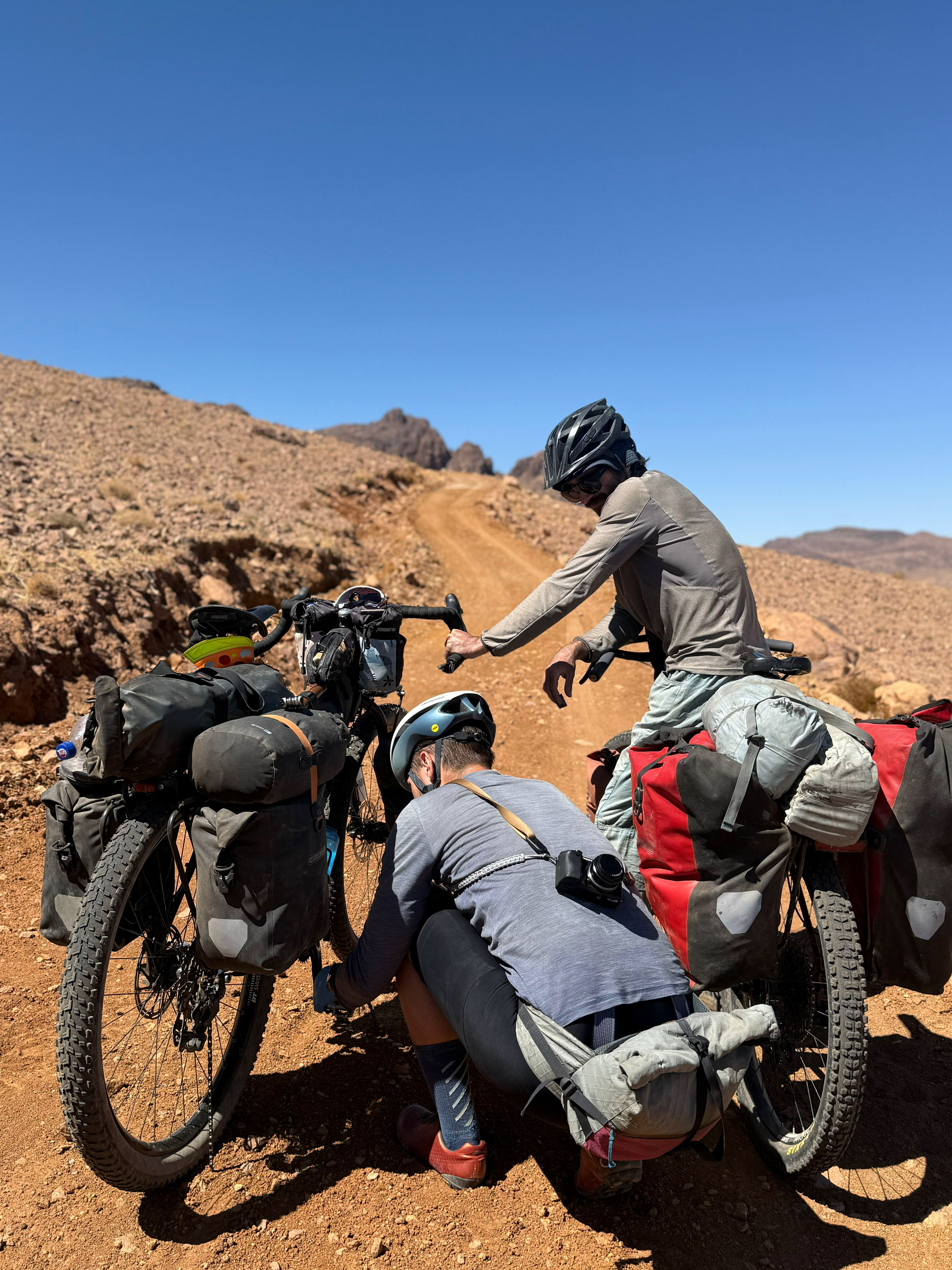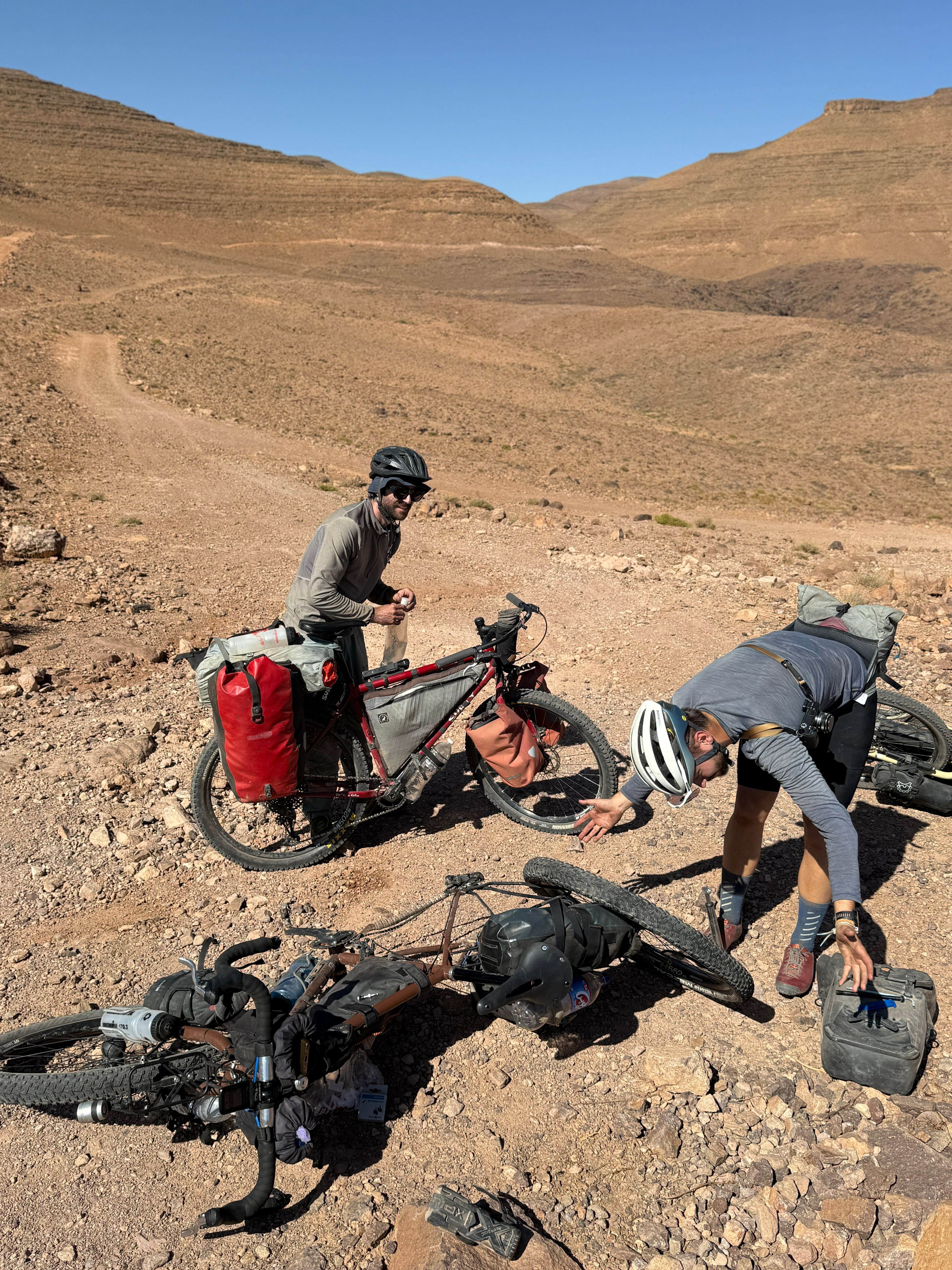 Zurück zum heutigen Tag: Ich stehe gegen Viertel nach sieben auf. Eigentlich sollen wir um halb mit dem Autofahrer gemeinsam frühstücken, Mohammed erreicht ihn aber nicht. Meine ungute Vorahnung wird glücklicherweise nicht bestätigt, und kurz nachdem wir mit dem Frühstück fertig sind, steht der Mann hupend vor dem Haus. Ich verabschiede mich jetzt ebenfalls von der Familie und schiebe mein Rad zur Straße. Wir verzurren es auf dem Dach des äußerst klapprigen Peugeot, der wahrscheinlich älter ist als ich. Erst liegt mein Rad auf der Antriebsseite, wir drehen es lieber nochmal um, ich habe Sorge, dass meine Schaltung beschädigt werden könnte. Ein Vorkommnis später am Tag würde mir diese Sorge für den Rest der Reise nehmen. Wir fahren nach Issil, dem nächsten größeren Dorf, wo ich Jack und Basil wieder treffen würde. Kurz vorher werde ich abgesetzt. Mohammed hat Sorge, erkannt zu werden und dann den Bus nicht mehr zu schaffen, weil ihn hier so viele Leute kennen. Anscheinend wohnen hier viele Leute aus seinem Dorf. Die wohnen laut seiner Aussagen aber auch sonst überall, gefühlt gehören die gesamten Berge zu seinem Dorf und alle weiteren Häuser, die wir auch in 20 Kilometern Entfernung noch sehen, gehören auch dazu. Ich verstehe das nicht so ganz, aber es wird schon sicher stimmen. Vor Issil mache ich die Bekanntschaft eines Kindes, es wird nicht das letzte Mal sein, dass uns dieser kleine Herr beehren wird. Immerhin dauert es nicht allzu lange, bis Jack und Basil kommen. Wir rollen gemeinsam ins Dorf, zum örtlichen, kleinen Café. Inzwischen verfolgt uns schon eine kleine Gruppe Kinder und während wir auf unseren Tee und die Omeletts warten, werden es immer mehr. Die anfängliche Schüchternheit legt sich schnell, und jegliche Berührungsängste verfliegen. Wir sind alle froh, gerade nicht alleine zu sein. Auch die Besitzerin des Cafés bekommt den chaotischen Haufen nicht in den Griff. Selbst der Besenstiel und vereinzeltes Steinewerfen hilft nicht. Sobald sie nicht mehr zu sehen ist, werden wir wieder belagert. Was sie außer den üblichen Fragen nach Süßigkeiten und Stiften noch von uns wollen, verstehen wir nicht. An meinem Fahrrad ist immer noch die Flasche mit der ekeligen Cola, aber ich weiß, würde ich diese an die Kinder verschenken, würden alle Dämme brechen. Immerhin sorgt die Präsenz der Cola Flasche dafür, dass sie nicht bemerken, dass in den anderen Taschen viel interessantere Süßigkeiten sind. Ein Junge probiert es immer wieder, dass ich bereits mehrmals den Kopf geschüttelt habe, bringt ihn nicht von seiner Mission ab. Allerdings muss Jack einmal einschreiten und ein paar Kinder davon abhalten, seine Luftpumpe zu entwenden. Irgendwann ist es uns genug und wir wollen gehen, das geht aber nicht, die Tochter der Familie weiß nicht, was die Dinge hier kosten, auch sie ist von der gesamten Situation überfordert. Zum Glück kommt bald ein älterer Herr, er kann auch die Kaffeemaschine bedienen. Die Kinder sind inzwischen verschwunden. Heute nehmen wir sogar Bananen mit auf unsere Tour. Frisches Obst auf dem Fahrrad, ein Luxus, der mir bisher in Marokko noch nicht zuteil geworden ist. Der Start unserer Route führt uns über perfekt fahrbare Wege und wir fließen über die Hochebene, ganz entspannt und ohne den Lärm von vorher. In der Ferne können wir aber bald unseren ersten Anstieg des Tages sehen, können. Dieser sollte es in sich haben, nicht nur, was die Höhenmeter angeht. Angestrengt kurbeln wir die steile Schotterpiste hinauf, bis mir, gerade am steilsten Stück mit über 16 %, die Kette reißt. Erstmal kein Problem, ich habe ja ein Ersatzkettenschloss dabei. Wir beglückwünschen uns für den schnellen Reparatur-Boxenstopp, bis wir bemerken, dass nicht nur die Kette gelitten hat. Normalerweise sind die Schaltwerke an dünnen Metallstücken montiert, so genannten Ausfallenden, die im Notfall als Sollbruchstellen agieren sollen, um das Schaltwerk zu schützen. Mein Ausfallende ist aber besonders massiv, und das Ersatz-Ausfallende hätte ich auch zu Hause lassen können. Denn es ist immer noch perfekt in Form. Gar nicht gut sieht hingegen das Schaltwerk aus, es ist in mehrere Richtungen verbogen. Wir probieren, es provisorisch mit Basils Mini-Zange in Form zu bringen, so richtig will das aber nicht funktionieren. Zum Glück habe ich Schalthebel, die sowohl mit indexierten Gängen funktionieren, also die einzelnen Schaltschritte durch Klicken, als auch manuell in eine Position gebracht werden und danach das Schaltwerk entsprechend anpassen. Ich hätte das als Gimmick für die Singapur Reise gerne mitgenommen, Ersatzteile hätte ich so deutlich einfacher bekommen, am Ende funktioniert mit der manuellen Justage quasi jedes Schaltwerk an meinem Fahrrad. Jetzt soll es mir aber auch hier sehr helfen. Ich kann jetzt die Gänge irgendwie noch etwas hin und her würgen, um überhaupt noch zu schalten. Sauber läuft die Schaltung natürlich überhaupt nicht mehr. So kommt es kurze Zeit später dazu, dass die Kette über das größte Ritzel springt und auch zwischen Kassette und Speichen verhakt. So fest, dass wir sie mit egal wie starkem Ziehen nicht bewegt bekommen. Die einzige Lösung ist am Ende, mit dem längsten Inbus, den wir haben, und einem Stein so lange auf das verkeilte Stück zu hämmern, bis es wieder frei ist. Wir haben wieder einiges an Zeit verloren, aber die Stimmung ist immer noch gut und es werden die gleichen Witze wie die letzten vier Stunden und die letzte Woche gemacht. Ich passe noch ein paar Einstellungen an, damit so ein Vorfall nicht mehr passieren kann, das Schaltwerk ist aber ohnehin ein Totalschaden. Danach rolle ich mit meinem rasselnden und quietschenden Foltergerät weiter. Wenn mich die Hitze der Sahara nicht in den Wahnsinn getrieben hat, lange wird es hiermit nicht mehr dauern. Die Chance auf ein Ersatzteil ist auch äußerst gering, mir wird nichts anderes übrig bleiben, als bis nach Agadir mit dem rasselnde