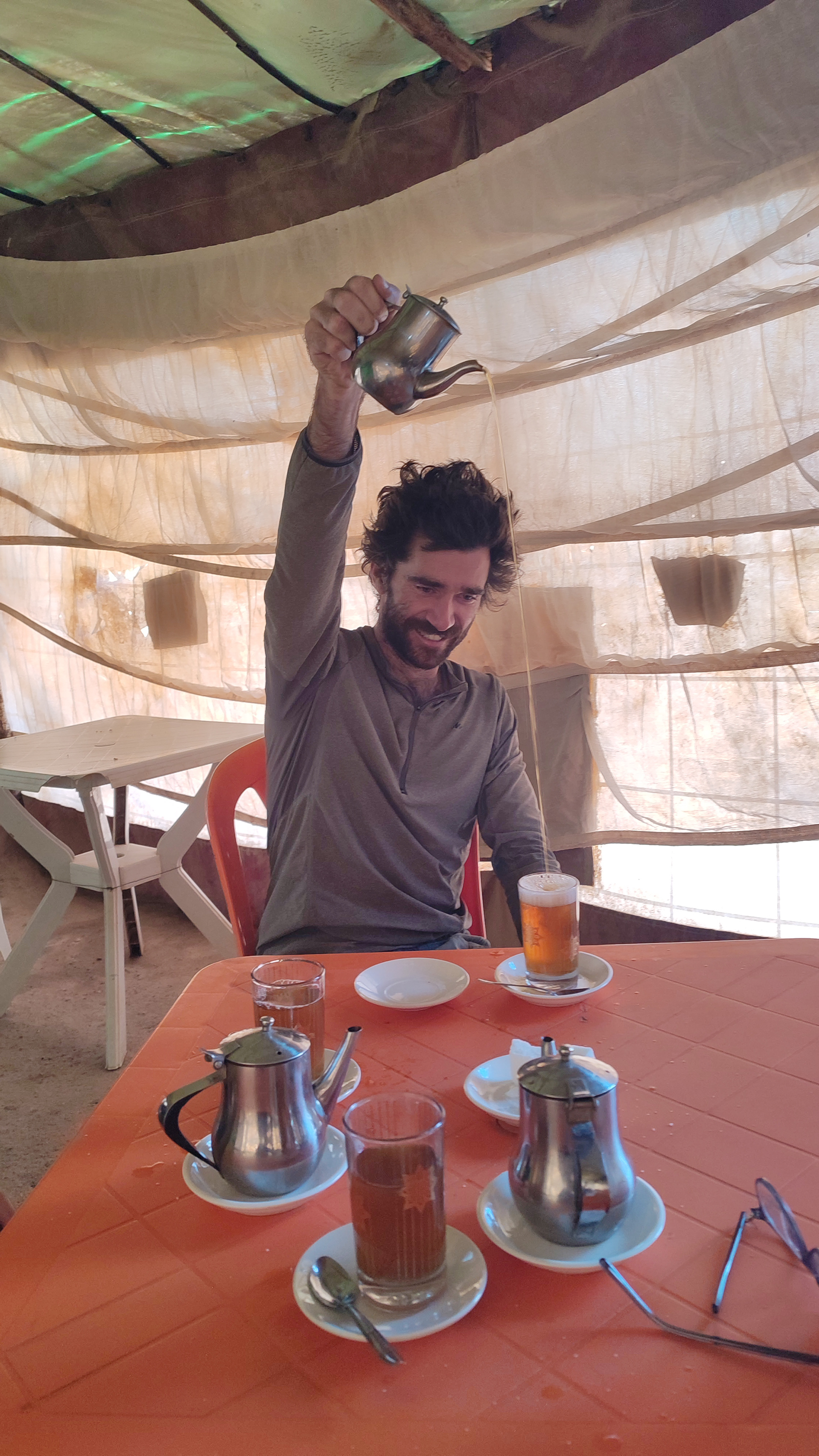 Die Nacht war nicht gut, und auch am nächsten Tag geht es mir nicht besser. Zum Frühstück gibt es eine Art Porridge mit Datteln, welches sehr gut tut. Das anschließende Brot dreht mir dann den Magen wieder um. Ich entscheide mich, mich erstmal wieder hinzulegen und weiterzuschlafen. Immerhin wird mir nicht wieder richtig übel. Die Jungs gehen zurück zu dem kleinen Laden, Basil geht es wieder deutlich besser und jetzt hat er auch Lust auf einen Kaffee. Mohammed zeigt ihnen noch etwas das Dorf. Als sie zurückkommen, ist klar, ich fahre heute nirgendwo mit dem Fahrrad hin. Wir fangen an, uns zu beratschlagen. Sie könnten hier warten, damit verlieren wir aber einen Tag, und die Etappenaufteilung wäre auch nicht so optimal. Dafür liegen die Versorgungspunkte einfach zu suboptimal. Meine Idee, einfach sie vorausfahren zu lassen und mit dem Taxi nachzukommen, scheint die beste zu sein. Bis zum nächsten Dorf sind es noch 28 km mit 800 Höhenmetern, die wir gestern eigentlich noch fahren wollten. Perfekt für einen halben Tag, inzwischen ist es bereits halb 12. Kurz darauf haben wir einen Mann aus dem Dorf organisiert, der mich morgen fahren kann. Ich lege mich wieder hin, der Rest verabschiedet sich herzlich von der netten Familie und fährt los.