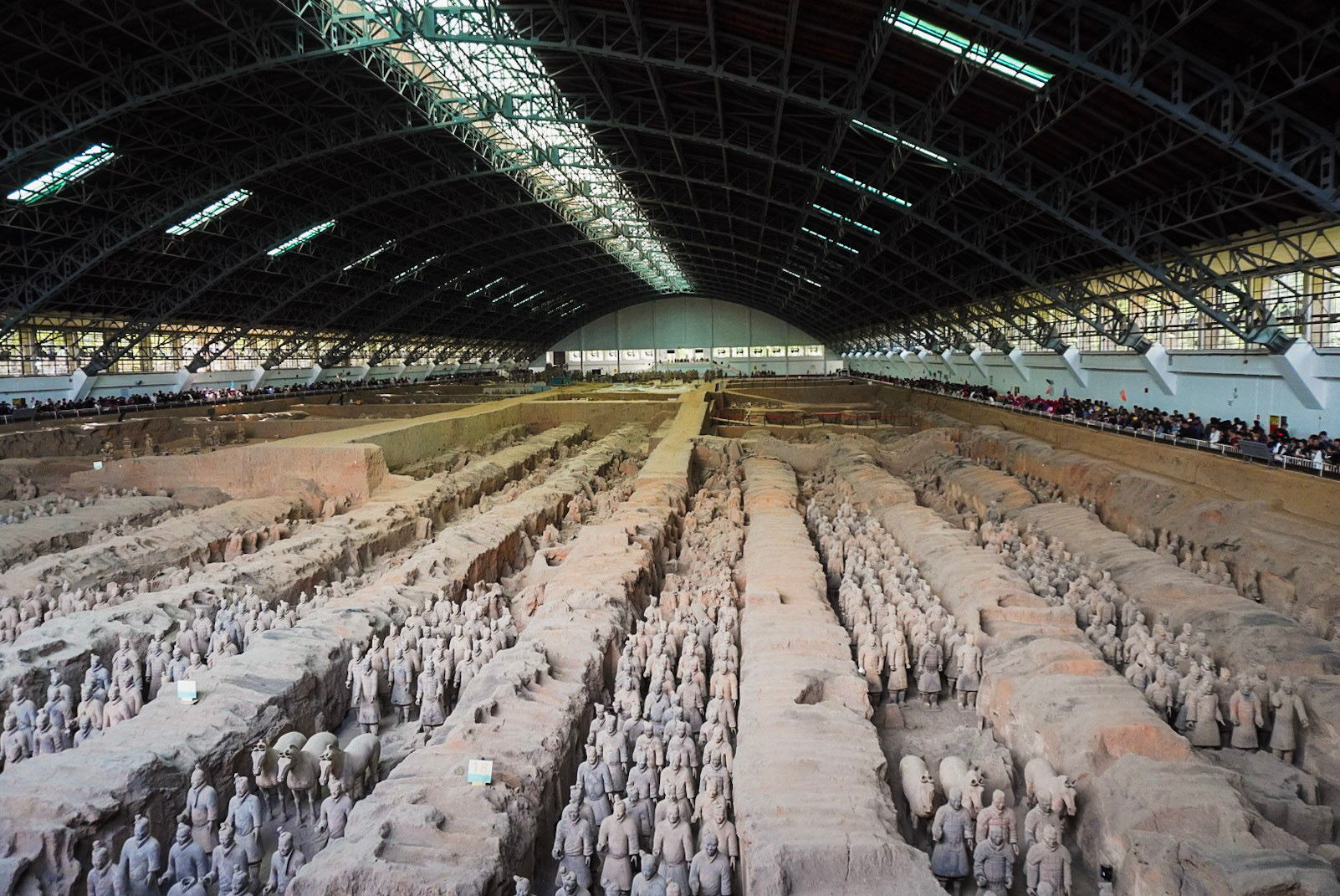 Dann geht es zum ersten Pit, der Grube mit den Infantriesoldaten und dem größten Teil der Armee. Die gesamte Armee wurde für den ersten chinesischen Kaiser Qín Shǐhuángdì errichtet. Er ordnete die Konstruktion direkt nach Ergreifung der Macht an, aber richtig fertiggestellt wurde die Armee in seinem Leben nie. Nach seinem Tod wurden die Arbeiten quasi direkt eingestellt. Die Arbeiter, meist Zwangsarbeiter, Gefangene und ausgemusterte Soldaten wurden in den Gruben lebendig begraben, damit die Lage der Armee nicht bekannt wird. Grundsätzlich war der Kaiser für seinen Größenwahn und Brutalität bekannt. Er ließ außerdem einen riesigen Palast bauen. Die Projekte waren gigantisch, es wurden so viele Arbeiter auch vom Land eingezogen, dass ganze Landstriche nur noch von Frauen und Kindern bewohnt wurden, die Landwirtschaft stagnierte und weitere Probleme entstanden. Der nächste Kaiser hat, wie oft schon geschehen, den Großteil der Bauwerke und des Vermächtnis seines Vorgängers zerstört. Die Ruine des Palasts muss dabei mehrere Monate gebrannt haben. Auch wurde die Holzkonstruktion über den Soldaten angezündet, auf der noch Erde aufgeschüttet war. Die Soldaten wurden so verschüttet und zu sehr großen Teilen beschädigt. Die Holzkonstruktion über den Soldaten wurde schon gebaut, bevor die Figuren alle aufgebaut wurden. Es hat also niemand jemals die komplett intakte Armee gesehen. Das ebenfalls sehr große Grabmal (angeblich größer als die Pyramiden in Gyzeh) besteht aus einer gigantischen Anlage aus diversen Mauern, Hallen, Stallungen und dem Kernstück einem künstlich aufgeschütteten Grabhügel. Dieser ist bis heute nicht geöffnet, erst wenn die Techniken zur Konservierung ausreichend fortgeschritten sind, darf die Arbeit dort beginnen. Es wird erwartet, dass dies noch über 50 Jahre dauern wird.