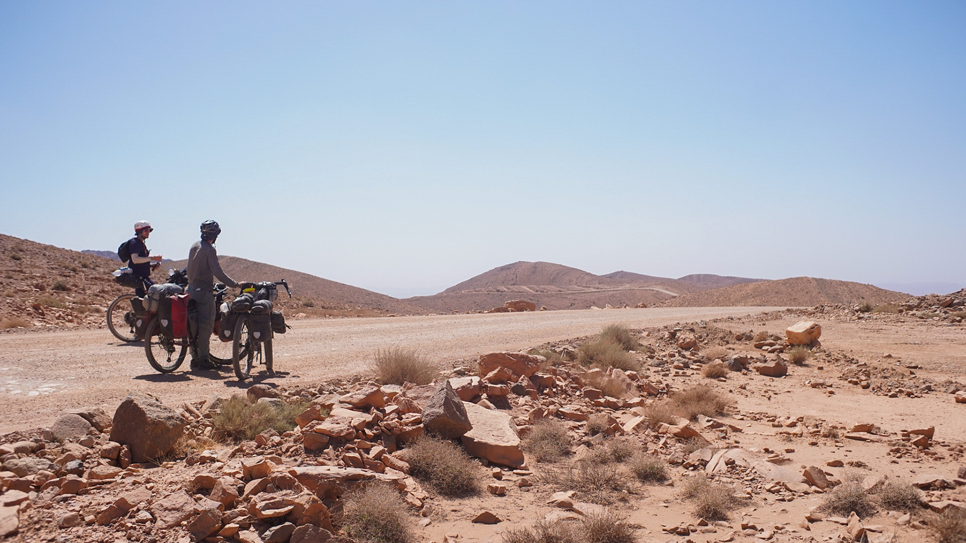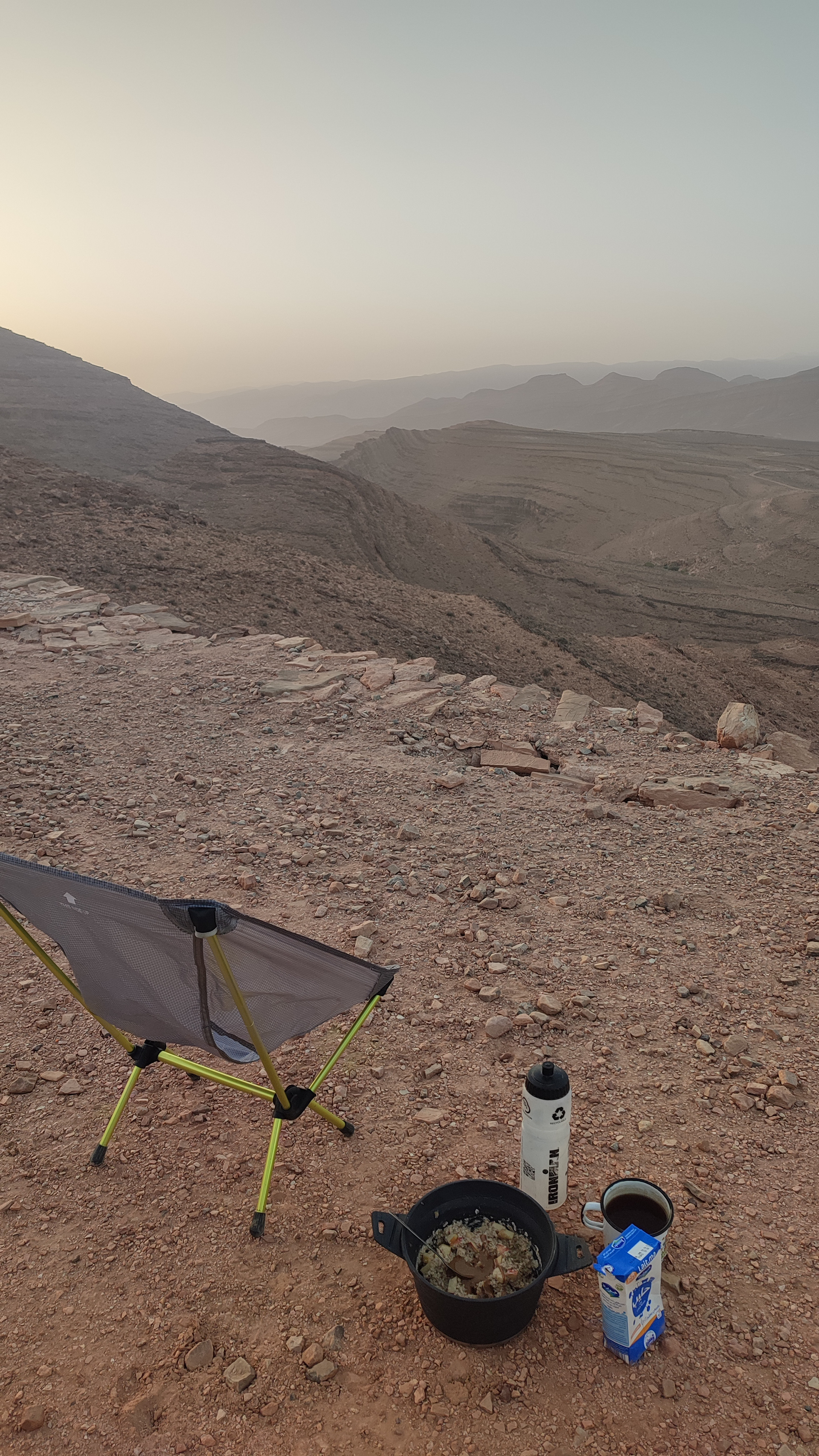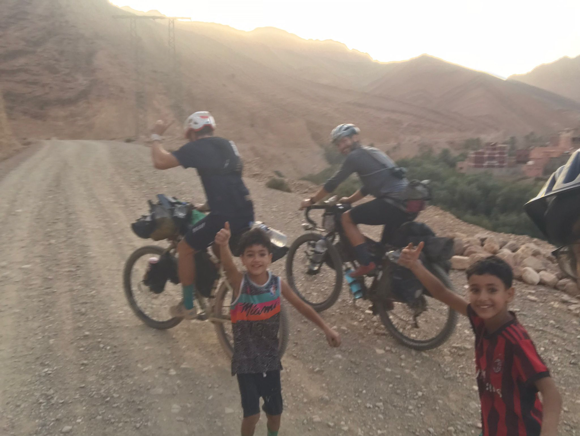 Dafür ist der Morgen richtig gut. In den letzten Tagen ist mir klar geworden, nur Kekse am Morgen sind meiner Laune nicht so zuträglich. Gestern haben wir ordentlich eingekauft und ich mache mir aus meinem warmen Schlafsack heraus erst einen Tee und danach eine großzügige Portion Porridge mit Erdnussbutter, die ich vor den Sahara Tagen gekauft hatte. Dazu gibt es noch zwei Äpfel, ich muss sogar etwas kämpfen, um alles aufzuessen. Aber meine Laune ist richtig gut. Ich schließe mich Basils Beispiel an und probiere, nach einem Ruf der Natur, mein Toilettenpapier zu verbrennen, so kann ich auch den teilweise etwas riechenden Inhalt meiner Toilettenpapier Plastiktüte los werden. Bisher gab es nie Mülleimer, wo ich die Reste hätte los werden können, und ich musste alles immer mitnehmen.Leider brennt es nicht so gut und ich verbringe einige Zeit damit, ein ausreichendes Feuer zu starten. Irgendwann ist zum Glück alles Toilettenpapier Geschichte, dafür steht der Rest neben seinen gepackten Rädern und wartet auf mich. Alles wie in den guten, alten Zeiten. Natürlich werden heute wieder Liegestützen gemacht, Jack ist inzwischen bei fünf Sätzen mit 35 Liegestützen, eine beeindruckende Zahl. Ich mache heute sogar auch zwei Sätze mit, jedoch deutlich weniger. Die Energie spare ich mir lieber für den Tag. Das ist eine gute Idee, denn wir starten direkt mit dem Rest des Anstiegs, den wir gestern nicht mehr geschafft hatten. Die ersten anderthalb Stunden fahren wir daher bergauf. Es gibt noch eine kleine Abfahrt, am Ende kommen wir auf einen Schnitt von mir knapp über 8 km/h. Unser Freund, das Flussbett, ist diesmal nicht vertreten, trotzdem besteht der Untergrund zumeist aus faustgroßen, losen Steinen und allerlei anderem Geröll, die unser Vorankommen deutlich einschränken. Heute macht mir das aber alles nichts aus und ich fahre ganz entspannt den anderen in meinem Tempo hinterher. Zwischendurch tauschen Jack und ich einmal die Räder. Das Fahrgefühl ist ein ganz anderes, besonders das fehlende Gewicht ist spürbar. Irgendwie fühlt sich mein Rad aber dann doch eher wie zu Hause an. Die alte Kolonialstraße ist wirklich ein Highlight, wir sind alle sehr beeindruckt darüber, wie sie sich endlos lang durch die Berge schlängelt. Der Aufwand, um sie zu bauen, muss immens gewesen sein, Stein für Stein händisch platziert. Heute ist sie nur noch mit dem Fahrrad passierbar. Die weggeschwemmten Stücke verhindern die Durchfahrt mit dem Auto und auch die üblichen Motorradfahrer, die man hier überall sieht, würden dort wohl nicht weiter kommen. Irgendwie schon ein cooles Gefühl. Bald beginnt jedoch die Abfahrt, und damit das Ende unserer Zeit auf der Kolonialstraße. Am Anfang noch sehr steinig und verblockt, wird sie am Ende richtig schön flowig. Ohne groß zu bremsen, sirren unsere Räder über den perfekt schottrigen Untergrund, eine Wohltat. Der folgende Asphalt lässt uns ungeahnte Geschwindigkeiten erreichen, in den inneren Offroad Stücken hat sich alles über 25 km/h bereits sehr schnell angefühlt. Gegen Viertel vor drei kommen wir an unserem Mittagsstopp an. Mir geht es immer noch blendend. Die Häuser an der Straße sind etwas seltsam, gefühlt sind alle Restaurants, gleichzeitig wirkt es etwas heruntergekommen. Wir fallen wie Kinder im Spielzeugladen in einen Minimarkt ein. Ein Junge übersetzt unsere Wünsche, der Besitzer findet die Situation lustig. Ob er unseren wilden Einkauf innehalten, unterhaltsam findet, oder sich über den guten Umsatz freut, wahrscheinlich beides. Gut versorgt für den Abend und den kommenden Morgen, fallen wir im nächsten Restaurant ein. Eine große Essenbestellung folgt und kurz drauf drücken wir dem wirklich netten Besitzer diverse Stecker, Kabel und elektrische Geräte zum Aufladen in die Hand. Gestärkt und erholt machen wir uns auf den weiteren Weg. Durch unseren eher kurzen Tag gestern, wollen wir heute etwas Kilometer aufholen. Wir haben eine Unterkunft in ca 90 Kilometern gefunden diese ist unser Ziel für den nächsten Abend. Inzwischen sind es sieben Tage ohne richtige Dusche und auch unsere Radklamotten stehen inzwischen von selbst. Basil wurde bereits von Freunden gefragt, ob seine abgerissen Anziehsachen nur noch von Dreck zusammengehalten werden. Es läuft weiterhin sehr gut auf dem Asphalt und wir bekommen sogar noch ein Stück Bonusasphalt, das auf Komoot gar nicht mehr als Straße eingezeichnet war. Eigentlich erwarten wir jetzt das nächste Stück komplette Angelegenheit und Isolation. Wir setzen uns das Ziel heute noch 300-400 Höhenmeter zu erledigen und kurbeln über die diesmal wirklich gut fahrbare Schotterstraße los. Die erwartete Abgeschiedenheit bleibt aber aus. Überall stehen noch Häuser und noch mehr Leute sind hier unterwegs. Vielleicht ist sonntags Ausgehtag, aber in solch einer Häufung haben wir das bisher noch nicht erlebt. Die Suche nach einem Schlafplatz wird sich wohl eher schwierig gestalten, dafür können wir in einem kleinen Laden entlang der Straße noch eine Cola und viel besser Melonen ergattern. Damit ist auch das morgige Frühstück mehr als gesichert. Die Freude hält jedoch nur kurz an. Auf einer mini Abfahrt verabschiedet sich die Melone, natürlich vor einer sehr großen marokkanischen Zuschauergruppe und zerspringt in drei Teile, eine tolle Unterhaltung für die Locals. Die sterblichen Überreste der Melone werden in eine Tüte gepackt und weiter geht's, wir haben immernoch ein Interesse daran, sie morgen in unserem Frühstück zu verwerten.
