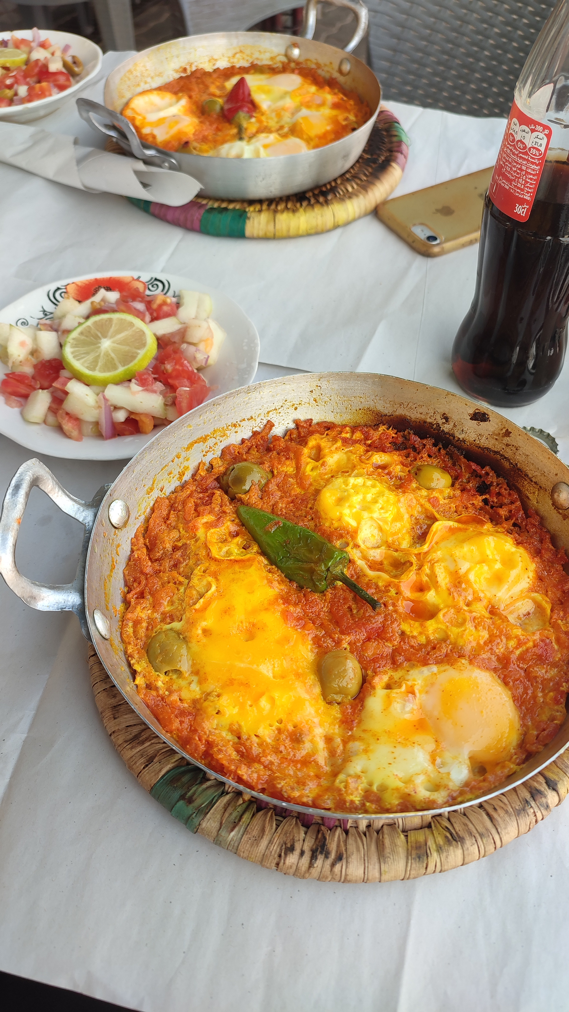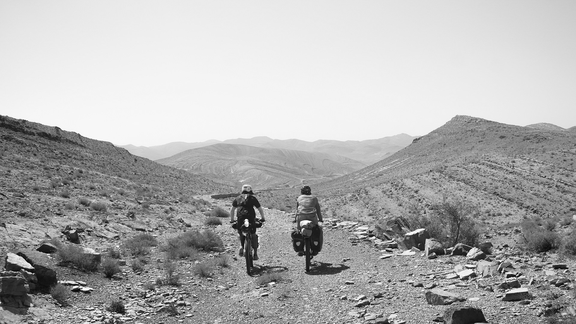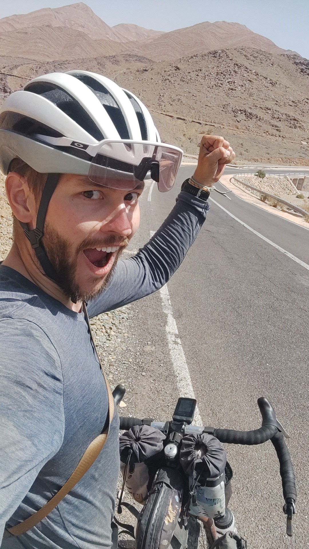 Dafür ist der Morgen richtig gut. In den letzten Tagen ist mir klar geworden, nur Kekse am Morgen sind meiner Laune nicht so zuträglich. Gestern haben wir ordentlich eingekauft und ich mache mir aus meinem warmen Schlafsack heraus erst einen Tee und danach eine großzügige Portion Porridge mit Erdnussbutter, die ich vor den Sahara Tagen gekauft hatte. Dazu gibt es noch zwei Äpfel, ich muss sogar etwas kämpfen, um alles aufzuessen. Aber meine Laune ist richtig gut. Ich schließe mich Basils Beispiel an und probiere, nach einem Ruf der Natur, mein Toilettenpapier zu verbrennen, so kann ich auch den teilweise etwas riechenden Inhalt meiner Toilettenpapier Plastiktüte los werden. Bisher gab es nie Mülleimer, wo ich die Reste hätte los werden können, und ich musste alles immer mitnehmen.Leider brennt es nicht so gut und ich verbringe einige Zeit damit, ein ausreichendes Feuer zu starten. Irgendwann ist zum Glück alles Toilettenpapier Geschichte, dafür steht der Rest neben seinen gepackten Rädern und wartet auf mich. Alles wie in den guten, alten Zeiten. Natürlich werden heute wieder Liegestützen gemacht, Jack ist inzwischen bei fünf Sätzen mit 35 Liegestützen, eine beeindruckende Zahl. Ich mache heute sogar auch zwei Sätze mit, jedoch deutlich weniger. Die Energie spare ich mir lieber für den Tag. Das ist eine gute Idee, denn wir starten direkt mit dem Rest des Anstiegs, den wir gestern nicht mehr geschafft hatten. Die ersten anderthalb Stunden fahren wir daher bergauf. Es gibt noch eine kleine Abfahrt, am Ende kommen wir auf einen Schnitt von mir knapp über 8 km/h. Unser Freund, das Flussbett, ist diesmal nicht vertreten, trotzdem besteht der Untergrund zumeist aus faustgroßen, losen Steinen und allerlei anderem Geröll, die unser Vorankommen deutlich einschränken. Heute macht mir das aber alles nichts aus und ich fahre ganz entspannt den anderen in meinem Tempo hinterher. Zwischendurch tauschen Jack und ich einmal die Räder. Das Fahrgefühl ist ein ganz anderes, besonders das fehlende Gewicht ist spürbar. Irgendwie fühlt sich mein Rad aber dann doch eher wie zu Hause an. Die alte Kolonialstraße ist wirklich ein Highlight, wir sind alle sehr beeindruckt darüber, wie sie sich endlos lang durch die Berge schlängelt. Der Aufwand, um sie zu bauen, muss immens gewesen sein, Stein für Stein händisch platziert. Heute ist sie nur noch mit dem Fahrrad passierbar. Die weggeschwemmten Stücke verhindern die Durchfahrt mit dem Auto und auch die üblichen Motorradfahrer, die man hier überall sieht, würden dort wohl nicht weiter kommen. Irgendwie schon ein cooles Gefühl. Bald beginnt jedoch die Abfahrt, und damit das Ende unserer Zeit auf der Kolonialstraße. Am Anfang noch sehr steinig und verblockt, wird sie am Ende richtig schön flowig. Ohne groß zu bremsen, sirren unsere Räder über den perfekt schottrigen Untergrund, eine Wohltat. Der folgende Asphalt lässt uns ungeahnte Geschwindigkeiten erreichen, in den inneren Offroad Stücken hat sich alles über 25 km/h bereits sehr schnell angefühlt. Gegen Viertel vor drei kommen wir an unserem Mittagsstopp an. Mir geht es immer noch blendend. Die Häuser an der Straße sind etwas seltsam, gefühlt sind alle Restaurants, gleichzeitig wirkt es etwas heruntergekommen. Wir fallen wie Kinder im Spielzeugladen in einen Minimarkt ein. Ein Junge übersetzt unsere Wünsche, der Besitzer findet die Situation lustig. Ob er unseren wilden Einkauf innehalten, unterhaltsam findet, oder sich über den guten Umsatz freut, wahrscheinlich beides. Gut versorgt für den Abend und den kommenden Morgen, fallen wir im nächsten Restaurant ein. Eine große Essenbestellung folgt und kurz drauf drücken wir dem wirklich netten Besitzer diverse Stecker, Kabel und elektrische Geräte zum Aufladen in die Hand. Gestärkt und erholt machen wir uns auf den weiteren Weg. Durch unseren eher kurzen Tag gestern, wollen wir heute etwas Kilometer aufholen. Wir haben eine Unterkunft in ca 90 Kilometern gefunden diese ist unser Ziel für den nächsten Abend. Inzwischen sind es sieben Tage ohne richtige Dusche und auch unsere Radklamotten stehen inzwischen von selbst. Basil wurde bereits von Freunden gefragt, ob seine abgerissen Anziehsachen nur noch von Dreck zusammengehalten werden. Es läuft weiterhin sehr gut auf dem Asphalt und wir bekommen sogar noch ein Stück Bonusasphalt, das auf Komoot gar nicht mehr als Straße eingezeichnet war. Eigentlich erwarten wir jetzt das nächste Stück komplette Angelegenheit und Isolation. Wir setzen uns das Ziel heute noch 300-400 Höhenmeter zu erledigen und kurbeln über die diesmal wirklich gut fahrbare Schotterstraße los. Die erwartete Abgeschiedenheit bleibt aber aus. Überall stehen noch Häuser und noch mehr Leute sind hier unterwegs. Vielleicht ist sonntags Ausgehtag, aber in solch einer Häufung haben wir das bisher noch nicht erlebt. Die Suche nach einem Schlafplatz wird sich wohl eher schwierig gestalten, dafür können wir in einem kleinen Laden entlang der Straße noch eine Cola und viel besser Melonen ergattern. Damit ist auch das morgige Frühstück mehr als gesichert. Die Freude hält jedoch nur kurz an. Auf einer mini Abfahrt verabschiedet sich die Melone, natürlich vor einer sehr großen marokkanischen Zuschauergruppe und zerspringt in drei Teile, eine tolle Unterhaltung für die Locals. Die sterblichen Überreste der Melone werden in eine Tüte gepackt und weiter geht's, wir haben immernoch ein Interesse daran, sie morgen in unserem Frühstück zu verwerten.