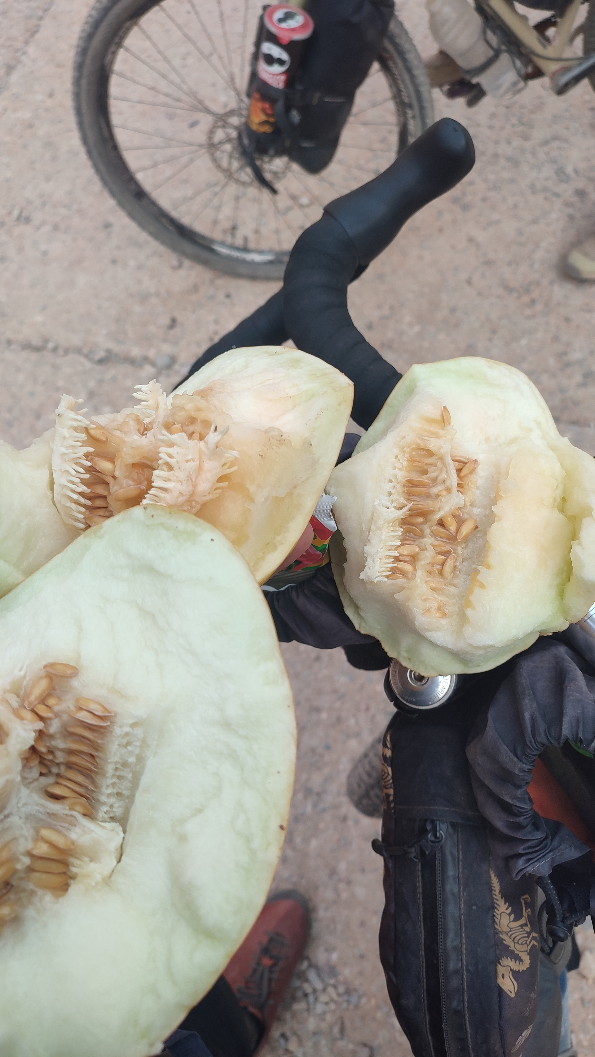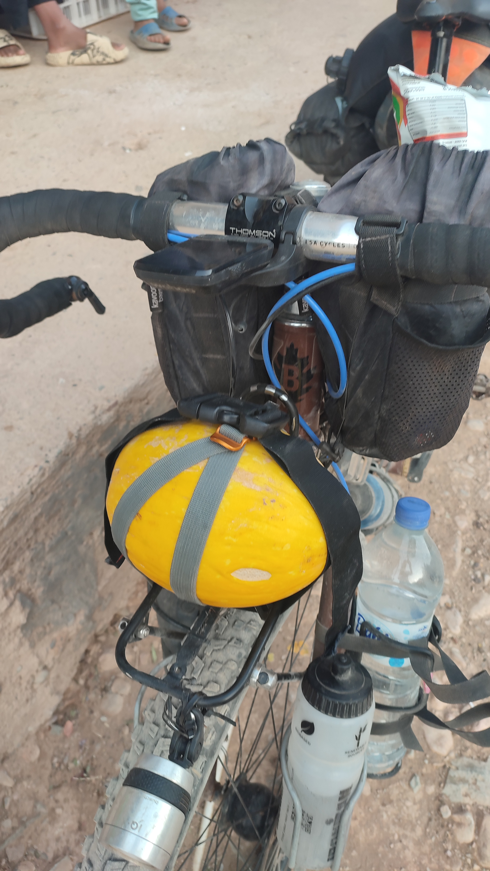 Besonders anstregend sind aber die Kinder hier. Erst Grüßen sie nett, danach rennen sie noch ziemlich lange hinter uns her und probieren die üblichen Süßigkeiten, Stifte oder Geld abzugreifen. Dass Jack eine Rolle Pringles draußen am Rad hat heizt die Situation nur noch mehr an. Die Kinder sind ziemlich ausdauernd, sowohl in ihrer Fragerei nach Geschenken als auch im Laufen, sie begleiten uns ein gutes Stück. Zum Glück wird es irgendwann flacher und wir können entkommen. Direkt an der nächsten Kuppe wartet die nächste Gruppe Kinder, dieses Spiel wird sich jetzt noch so einige Male wiederholen. Wir sind das gar nicht mehr gewohnt, zu abgelegen waren unsere letzten Tage. Während wir uns noch fragen, wo wir wohl wir heute wohl unser Zelt unentdeckt aufstellen können, kommen wir noch an einem kleinen Dorfladen vorbei. Es gibt noch eine Motivationscola und noch viel besser, wir kaufen zwei Honigmelonen. Eine packt Basil in seine bereits eh schon aus allen Nähten platzende Satteltasche, die andere spanne ich auf meinen kleinen Front Gepäckträger. So richtig stabil ist die Konstruktion nicht und es kommt wie es kommen muss, in einem kleinen Bergabstück verabschiedet sie sich und fliegt vor den Augen der Dorfjugend in hohem Bogen auf den Boden. Wir sammeln die Stücke ein und packen sie wieder ein. Diesmal kommt sie in einen Rucksack. Für Unterhaltung auf allen Seiten ist gesorgt. Unsere Suche nach einem Zeltplatz gestaltet sich als schwierig, es sind einfach überall Menschen und auch auf Google Maps sehen wir viele Häuser. Ein Platz sieht vielversprechend aus, es ist aber ein Friedhof. Also fahren wir weiter. Die gut fahrbare Schotterstraße ist inzwischen wieder dem Flussbett gewichen. Das Tal ist zu schmal für eine Straße neben dem Flussbett, an den Seiten werden die Häuser in die Höhe gebaut. Hier steht alles von alten Lehmhütten bis zu frischen Betonsteinhäusern in allen Bauphasen. Viel bekommen wir davon aber nicht mehr mit, es wird schnell dunkel und bald rumpeln wir im Schein unserer Dynamo-Lampen durch das Flussbett. Die Navigation ist schwierig, wir bewegen uns am unteren Ende der Geschwindigkeit ab der die Lampen funktionieren, aber schneller können wir auf dem Untergrund nicht fahren. Immer wieder flackern die Lampen oder gehen aus, wir sind im Blindflug. Bald ist es stockdunkel, wir sind aber weit genug von den letzten Häusern entfernt, dass wir uns einen Platz für die Zelte suchen können. Wir kramen unsere Stirnlampen heraus, Basil und Jack zischen los und kommen bald mehr oder weniger zufrieden zurück. Im Vergleich zu unserem Platz gestern haben wir es heute wohl nicht so gut getroffen, wir können aber auch eh nicht genug sehen um es zu beurteilen. Am Ende haben wir drei flache Plätze für unsere Zelte und das ist alles was zählt.